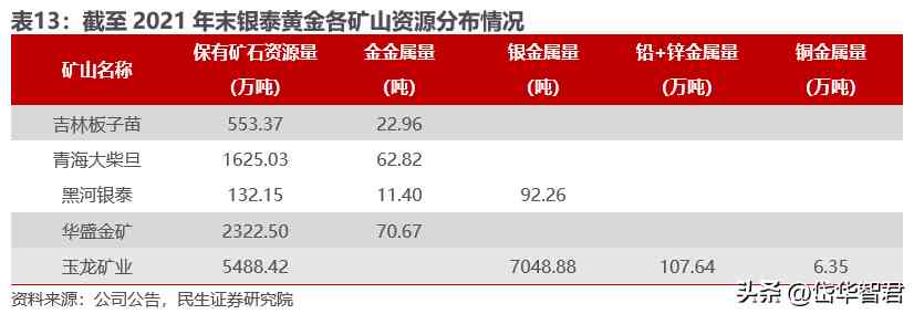 银泰黄金共拥有玉龙矿业、黑河银泰、吉林板庙子、青海大柴旦和华盛金矿五个子公司。其中玉龙矿业为铅锌银多金属矿矿山,其余皆为金矿矿山。截止至2022年末,银泰黄金拥有资源量金金属量170.45吨,银金属量7154.06吨,铅+锌金属量107.64万吨,资源禀赋充足。