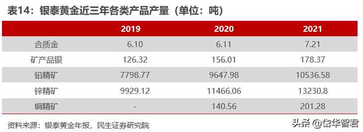 银泰黄金产品主要为合质金、矿产银、铅锌精矿等,2021年银泰黄金实现合质金产量7.21吨,同比增长18%;矿产品银178.37吨,同比增长14.33%。