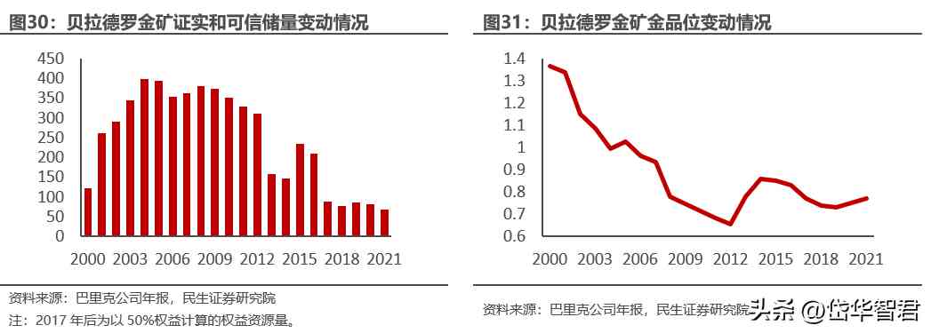 根据巴里克公司年报,贝拉德罗金矿于2005年投产运营,目前已运营17年,随着矿山运营年限增长和矿区深入开采,贝拉德罗金矿储量和金品位出现下降,截至2021年贝拉德罗金矿储量为68.43吨,平均原矿品位为0.77g/t。