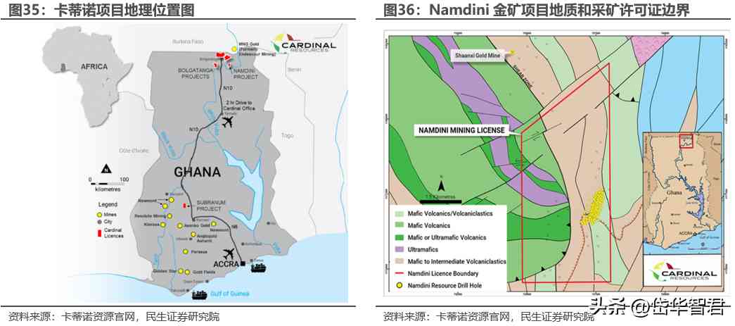 公司2021年完成收购卡蒂诺资源100%股份,其核心资产是位于加纳的3个矿权,分别是位于加纳东北部Bole-Nangodi成矿带的Namdini开发项目和Bolgatanga勘探项目,以及位于加纳西南部Sefwi成矿带的Subranum勘探项目。Namdini矿权采矿租约面积为63平方公里,矿权期限为15年,为目前在建核心项目。