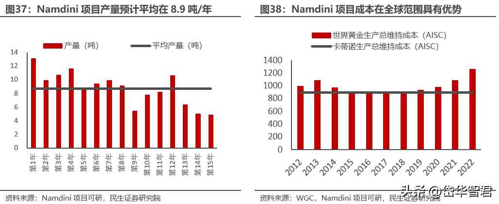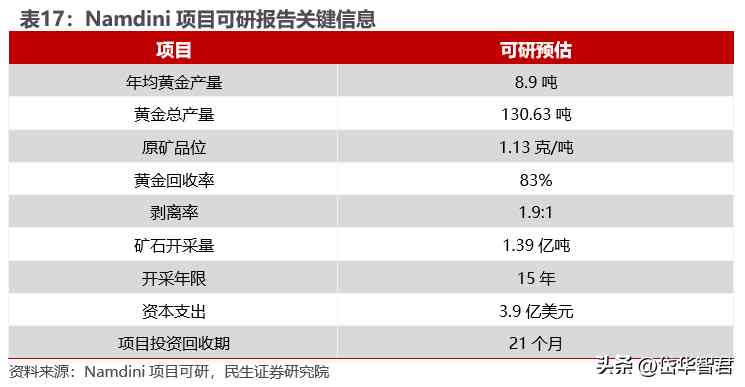 产量方面,根据可研报告,预计Namdini项目投产后平均年产黄金8.9吨,投产后第1年的黄金产量为13.09吨,累计总产量规划130.63吨,采选回收率为83%。