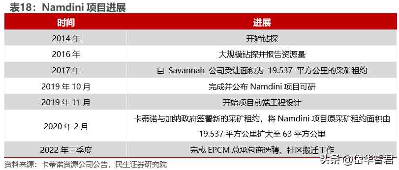 资源量方面,根据卡蒂诺资源2019年发布的Namdini项目可研报告,Namdini项目探明+控制+推断资源量约217.4吨。
