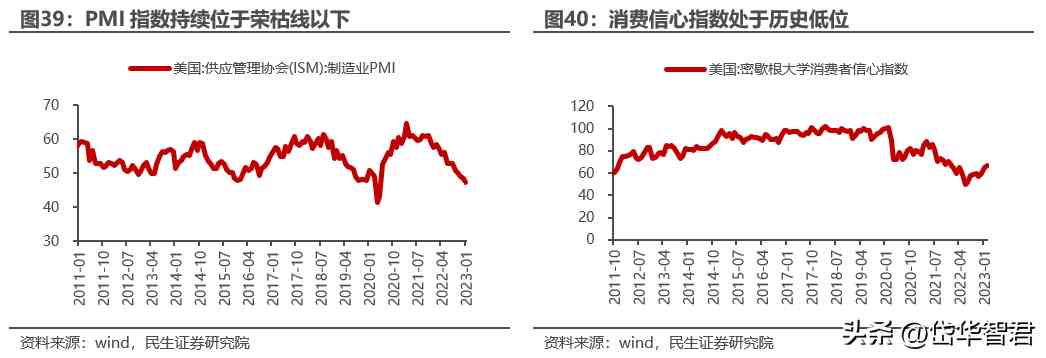 从制造业端来看,美国ISM制造业PMI指数子2022年6月份以来连续8个月内下降,目前位于枯荣线以下,制造业投资疲软。美国消费者信心指数虽然近期出现反弹,但整体处于10年来低位,反应消费者对未来经济预期仍然较弱。