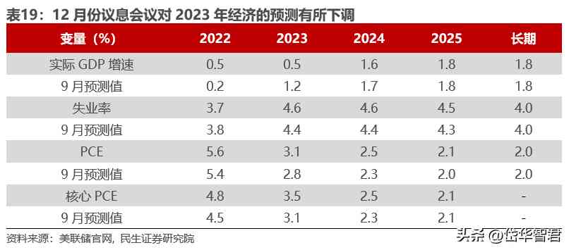 美联储在12月份的议息会议中进一步下调了对未来经济增长的预期,将2023年美国GDP增长率预期由原来的1.2%下调至0.5%,考虑到持续的加息对经济带来的压制,同时也上调了失业率预期,此外将核心消费物价指数预测值进一步上调,也反映了美联储承认通胀的顽固,经济下行压力逐步牵制美联储货币的紧缩。