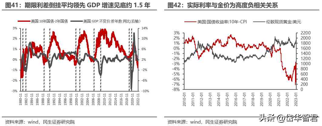 实际利率角度,2023年对金价有利。实际利率作为持有黄金的机会成本,从历史上来看与金价成高度负相关。在“实际利率=名义利率-CPI”的模型下,根据我们的预测,随着加息在23年上半年停止,名义利率也将于上半年见顶,随着美国国内经济下行压力逐步扩大,下半年将呈现趋势性走弱。