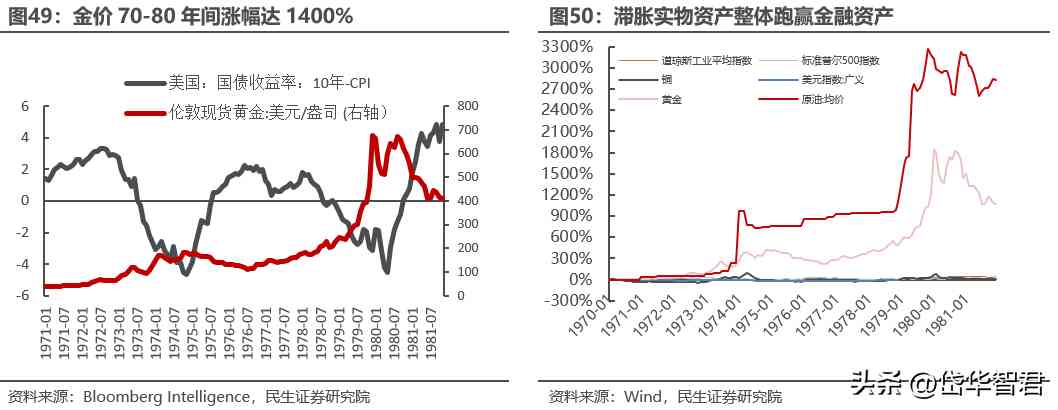滞胀时期由于货币供应过剩带来货币的购买力下降,除了贵金属外,各类其他实物资产价格也持续强势,而美元指数受美元超发和经济增长降速的影响下行,整体期间实物资产大幅跑赢金融资产,此外黄金作为天然货币,承担了主要的保值增值需求,如果不考虑70-80s两次石油危机的极端情况,黄金为涨幅为最明显品种。