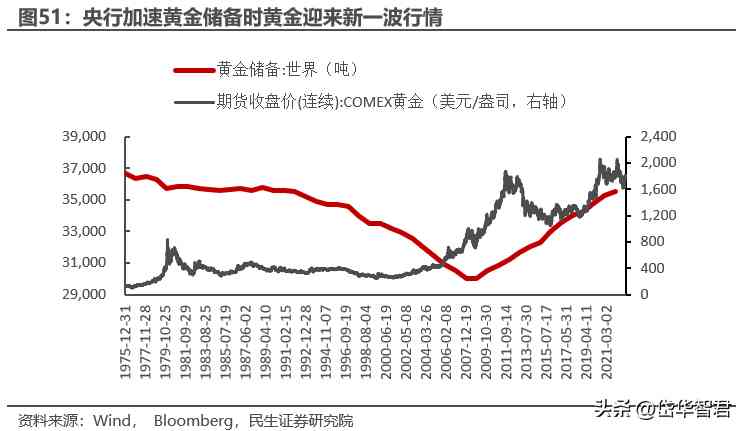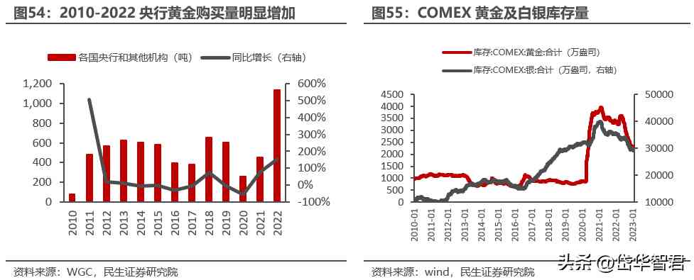 根据的数据显示,2022年全球央行购入黄金数量同比大幅增长152.31%,创下历史新高。2022年 2月份以来,comex黄金和白银库存累计分别下降了32%、17%,央行购金已在持续进行,未来黄金作为最重要的保值增值资产,预计将成为黄金购买的主力。