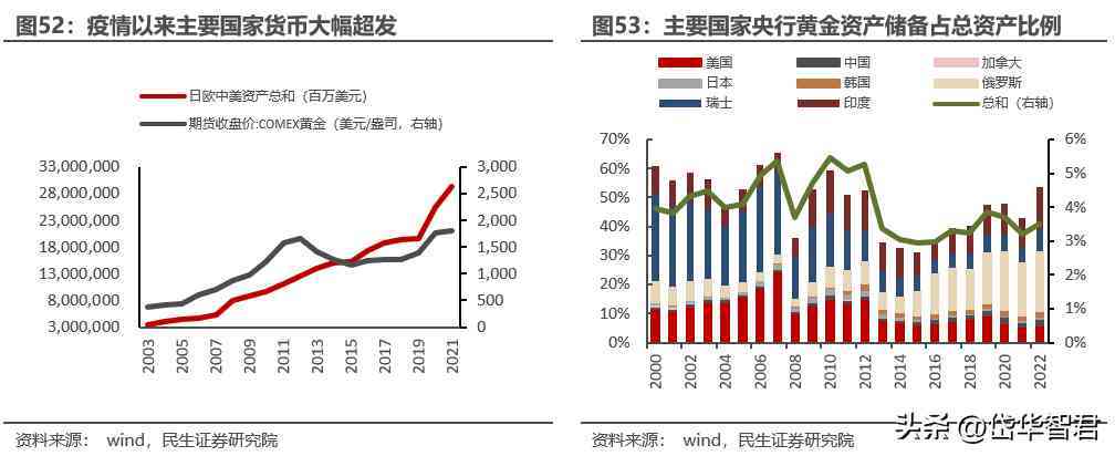 历史来看,每一轮央行大幅扩表后对应的黄金储备占比会在短期内较快速度下降,原因在于黄金的购买量没有跟上货币超发的速度。全球主要经济体央行2020年以来黄金储备占央行总资产的比例呈现下降趋势,尽管2022年央行购金大幅增长,但央行资产中黄金资产占比仍然处于历史较低位置,预计未来各国央行有望增加黄金储备,增补信用。