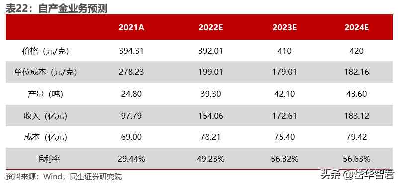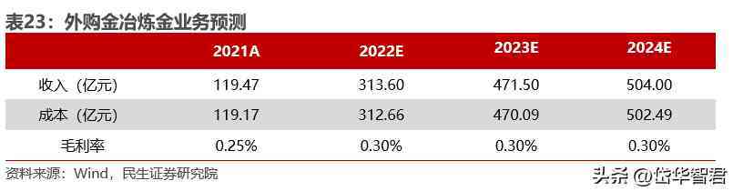 2)冶炼及精炼业务:考虑到公司冶炼金产能逐步恢复,受益于宏观经济的复苏,假设2022-2024的年冶炼金产量分别为80/115/120吨,毛利率维持在0.30%,外购小金条业务产量分别为20/20/20吨,毛利率维持在0.15%,对利润形成一定贡献。