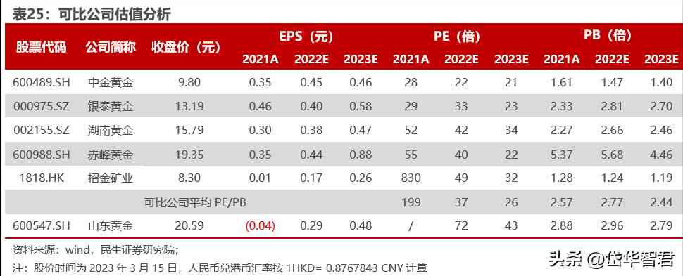 以2023年3月15日股价为基准,2022-2023年可比公司平均PE分别为37倍和26倍,山东黄金PE为72和43倍;2022-2023年可比公司PB分别为2.77和2.44倍,山东黄金PB为2.96和2.79倍。