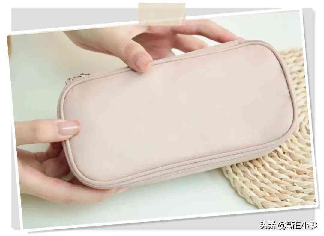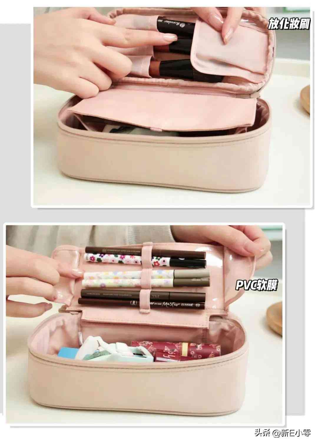 接下来呢是这个化妆包,这个化妆包有分不同形状不同颜色的,我买的是这个长方形的,有一定厚度,它就比较适合短途出门或者日常妆;