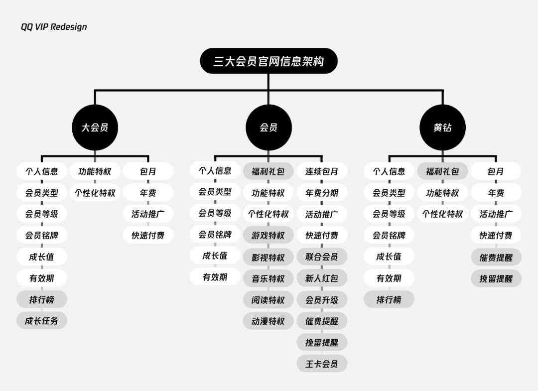 接下来从业务角度出发,分别梳理三大会员体系官网的信息架构。根据三大会员所涵盖的业务内容不同,官网中所包含的信息也有所不同。