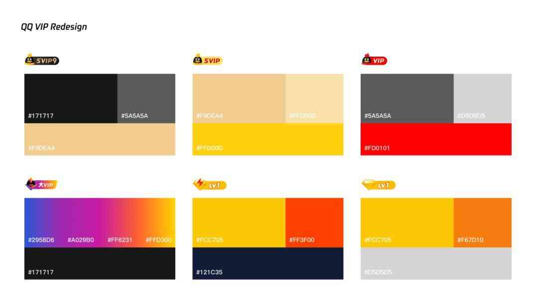 “视觉识别系统”是品牌调性的核心,决定了不同产品的延续性。将用户已认知的“普通会员”、“超级会员”、“普通黄钻”和“豪华黄钻”进行了延续,对新推出的“大会员”进行了特殊的炫彩渐变色设计,在这些会员系统的标准配色中结合不同会员体系的等级差异新增了辅助色系,提升产品的识别度。