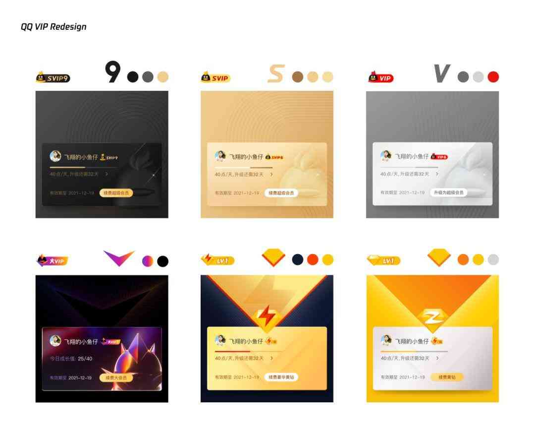 三大会员体系下还有着各自不同的会员类型,例如QQ会员体系下就分为普通会员(VIP)、超级会员1-8(SVIP)、超级会员9(SVIP9),在卡片设计中,每个不同卡片对应着一个信息模块,用户一眼看去就能清晰了解该模块的内容,根据不同卡片颜色即可区分会员的等级差异。
