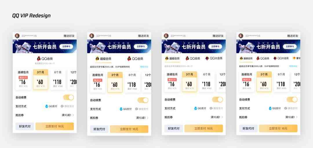 在梳理支付组件时,我们优化了支付体验,将支付流程进行了优化和统一。对不同会员体系支付操作的统一,可以降低用户的学习成本,提升支付的成功率。根据各个业务不同的内容模块,提取相应的信息内容,且打通不同会员支付体系,可相互切换引流。我们在“会员”、“黄钻”和“大会员”的系统标准配色中提取了黄色与金色进行了渐变处理,让支付组件内容整体化。