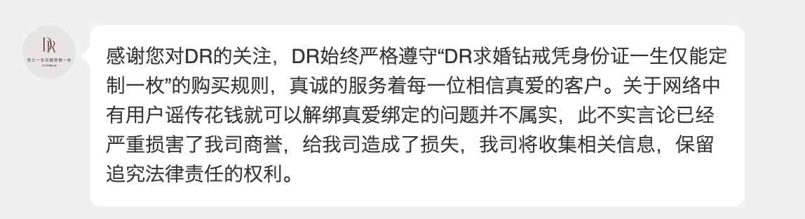 DR钻戒官网信息也显示,首次购买产品时要求购买者提供所在国家或地区的身份ID信息,此信息用于证明其合法公民身份,该信息与DR求婚钻戒产品绑定,该信息将加密留存在官网数据库中,仅接受通过官网验证查询并且终生不得修改。DR求婚钻戒要求购买产品时,签署《真爱协议》自愿提交产品受赠方姓名与相关信息,以明确说明购买者将DR求婚钻戒产品赠予谁,此信息接受官网验证查询,以上信息并终生不可修改。