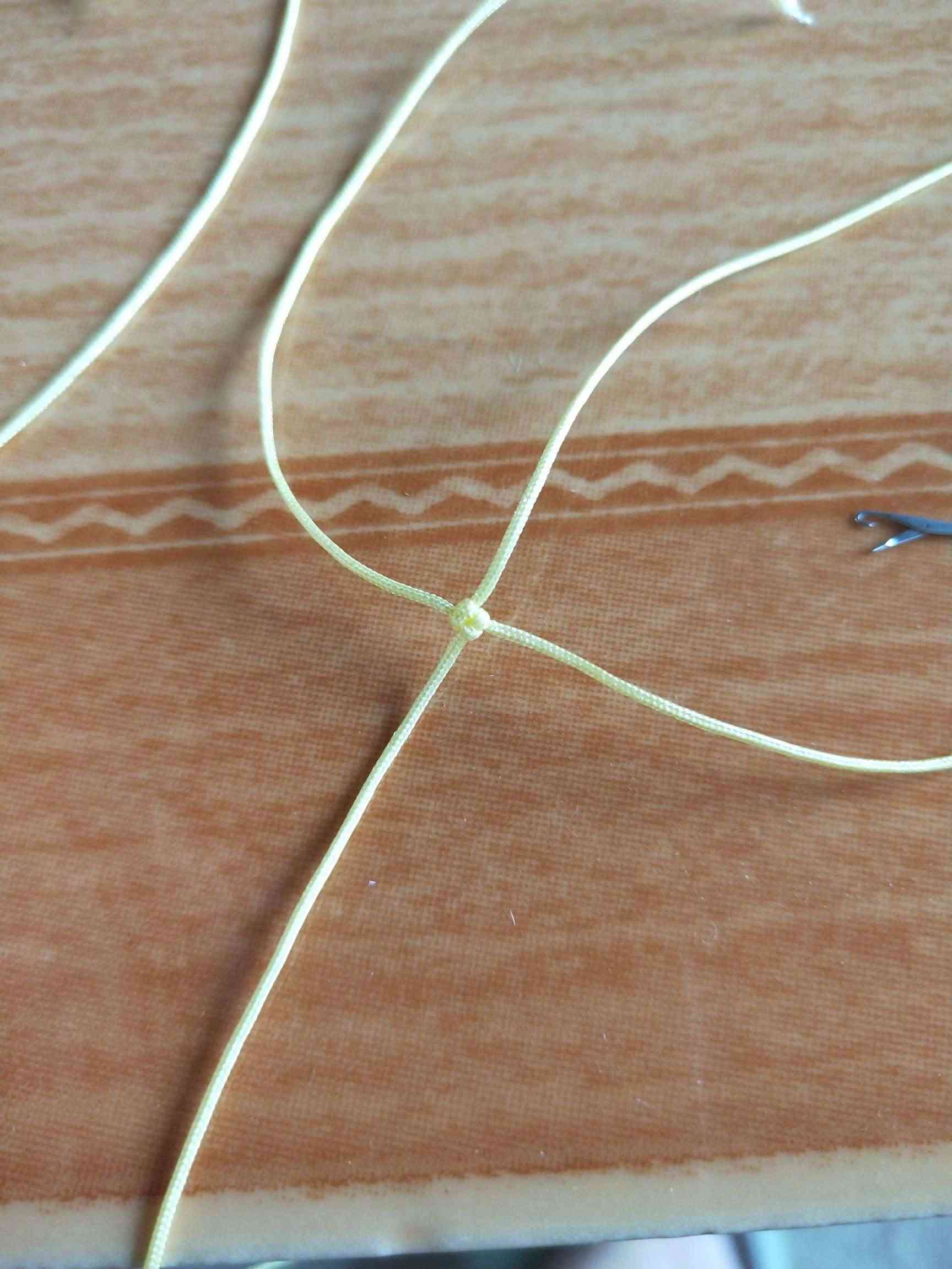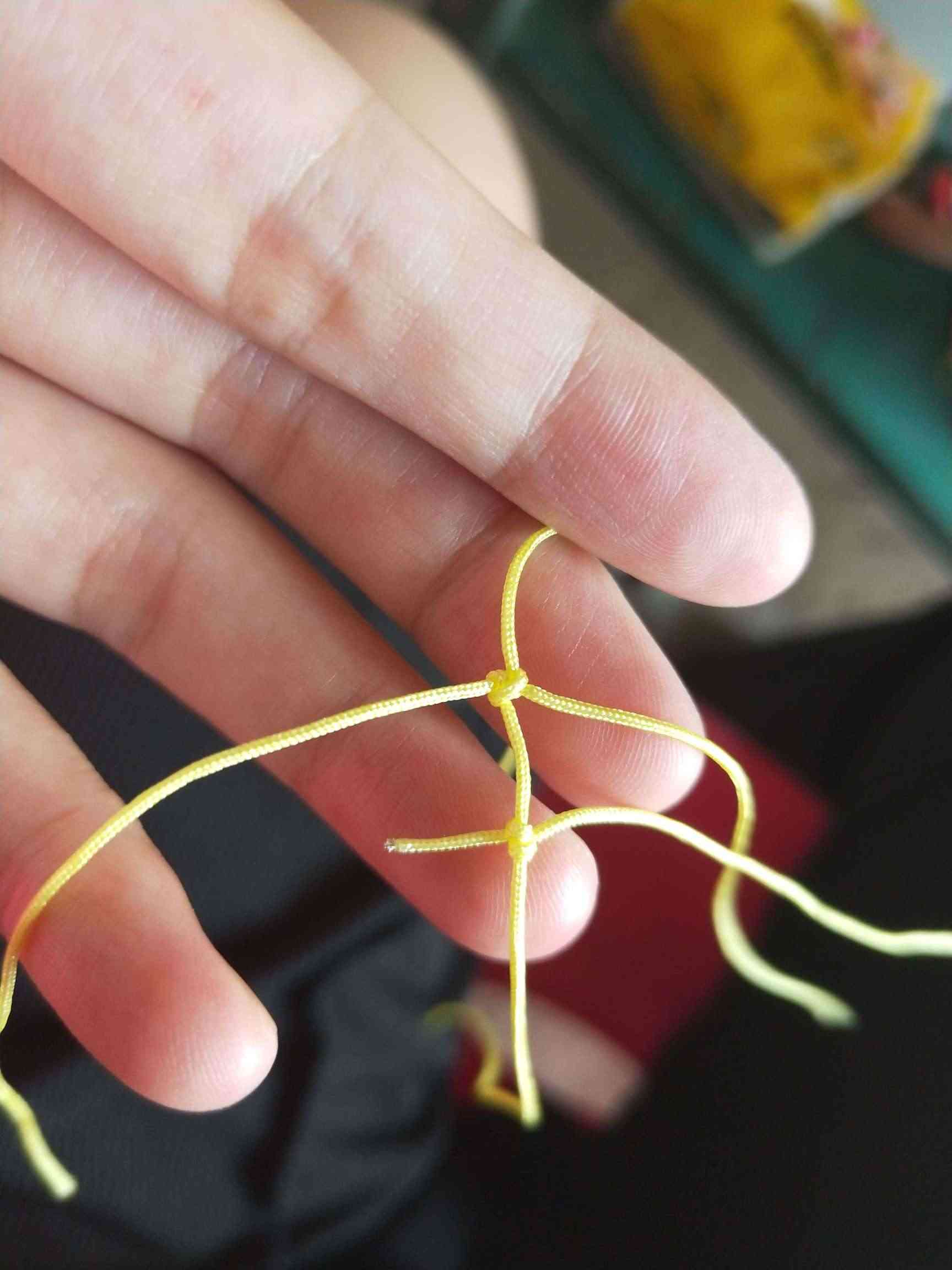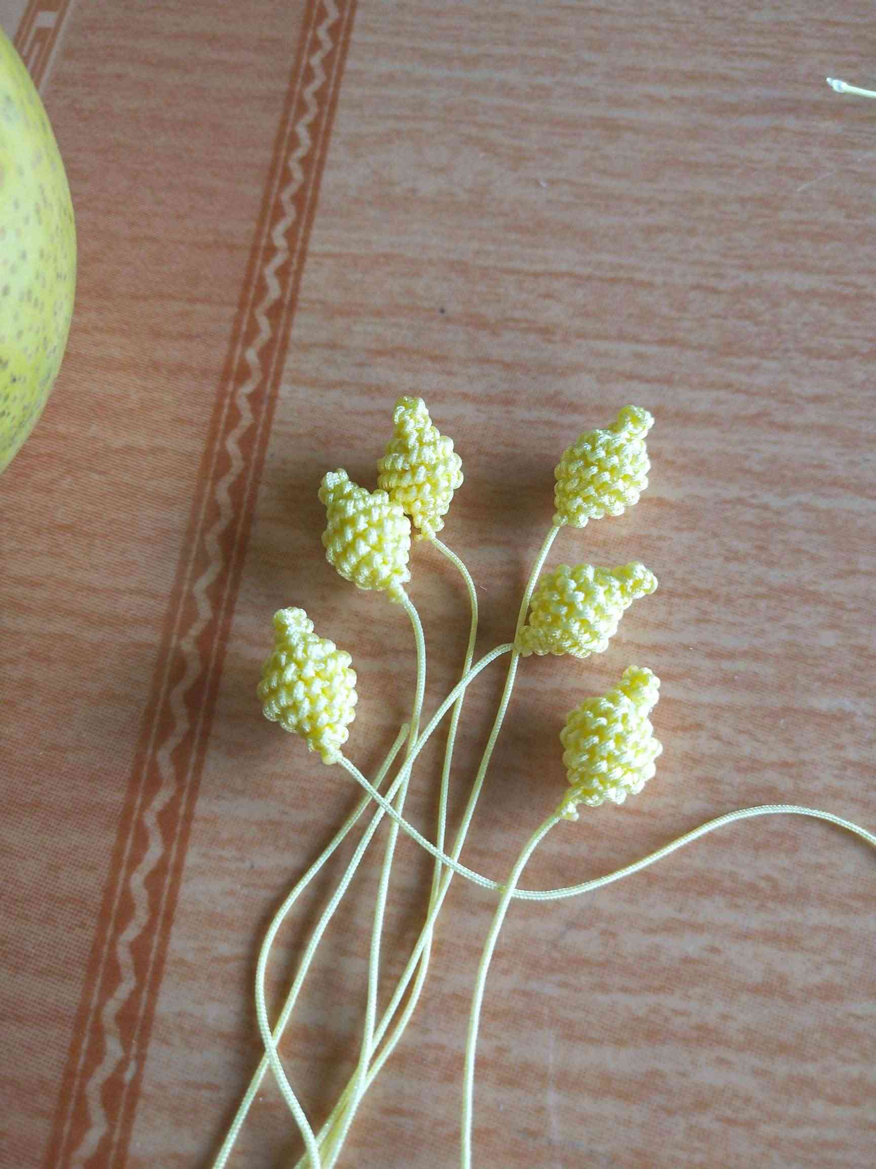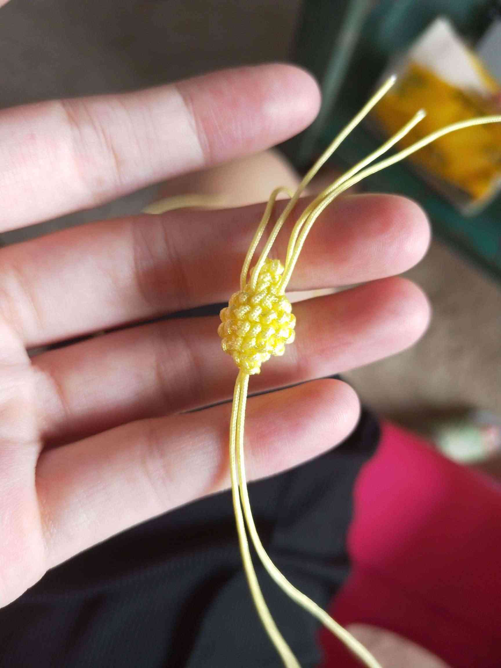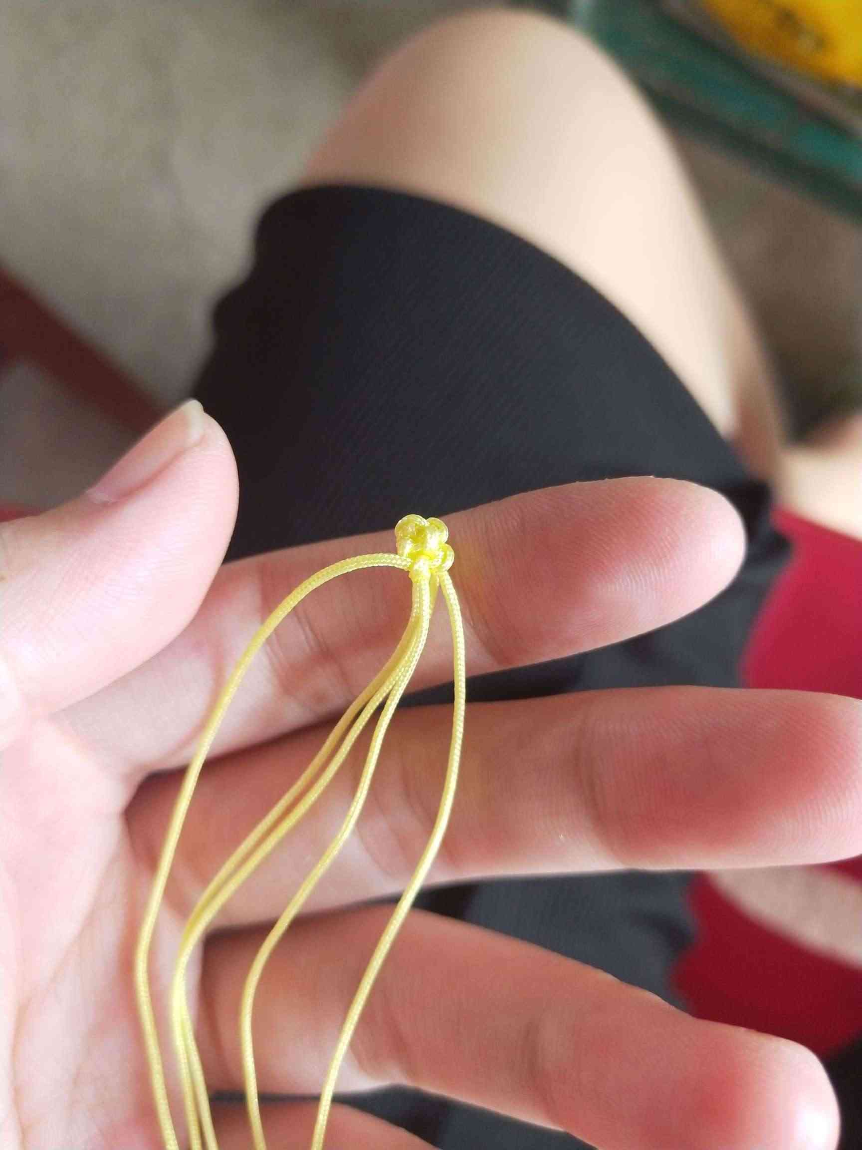 1、两条黄色玉线,一条为30cm,一条为20cm做一个玉米结,留一根比较长,其他三条的长度一样长即可。