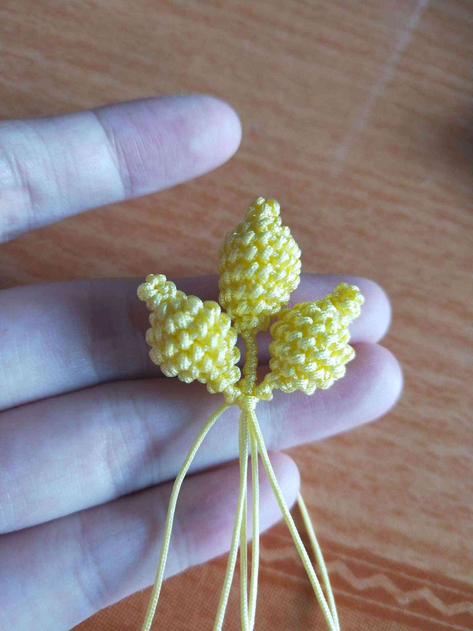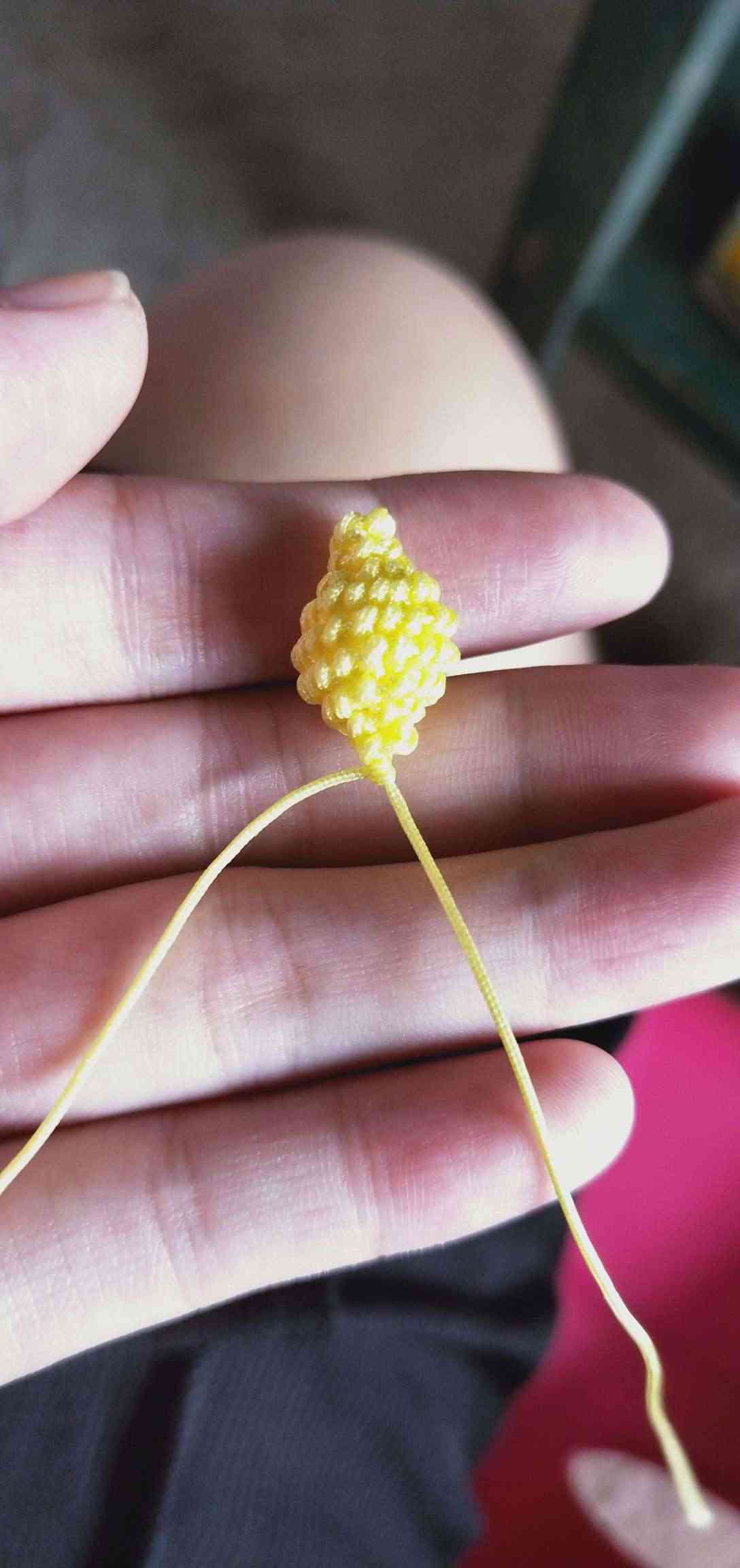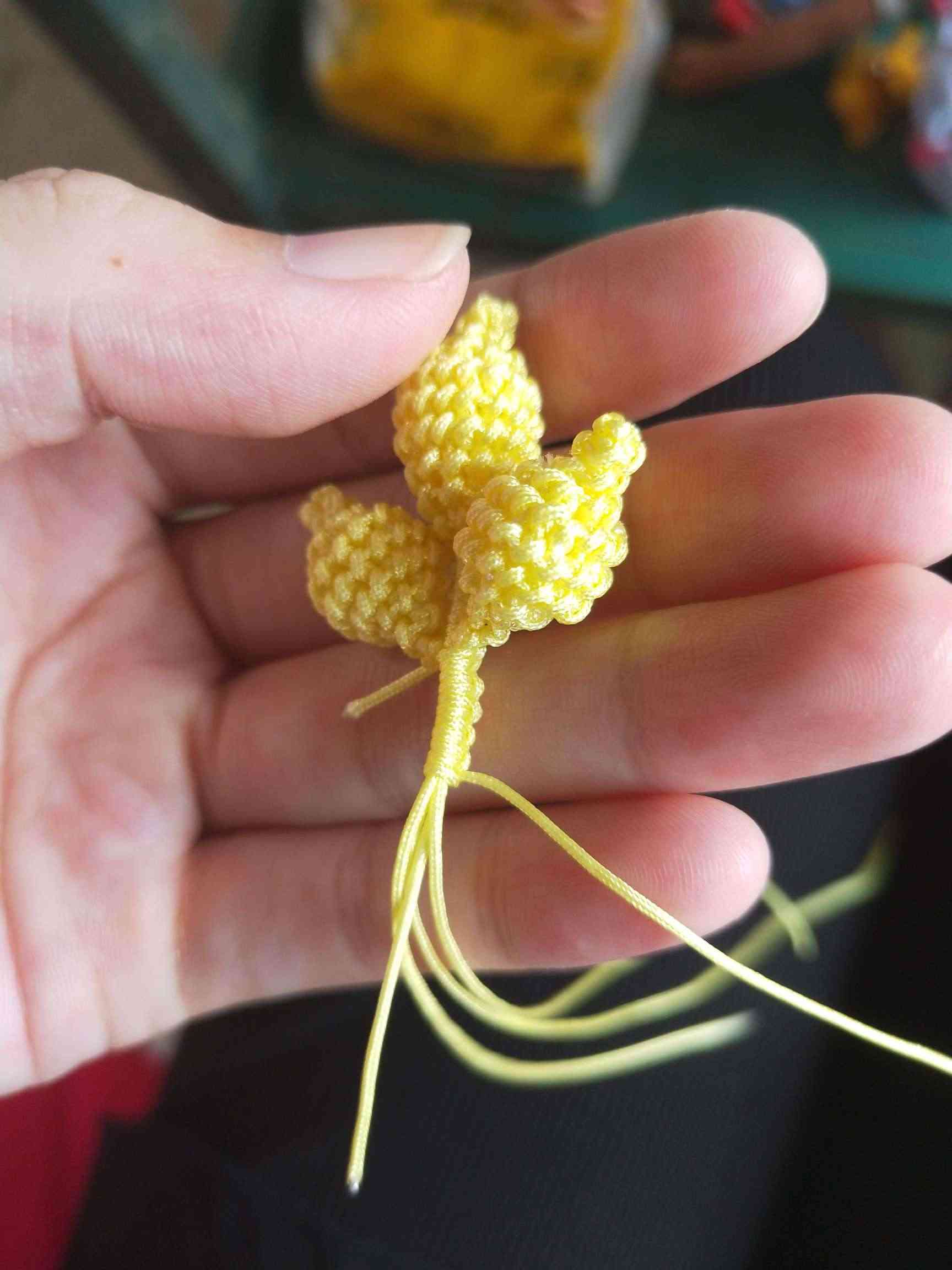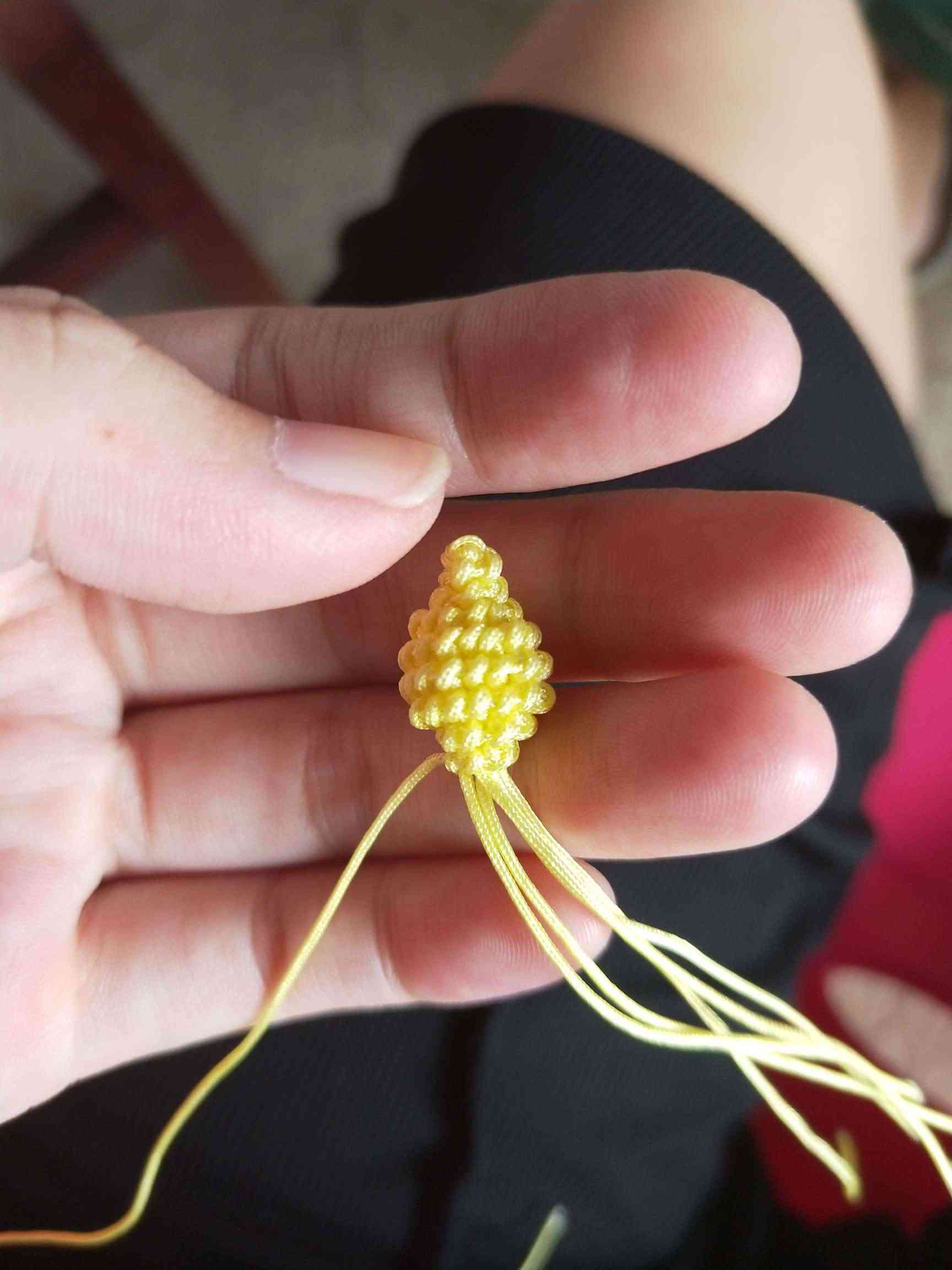 1、两条黄色玉线,一条为30cm,一条为20cm做一个玉米结,留一根比较长,其他三条的长度一样长即可。