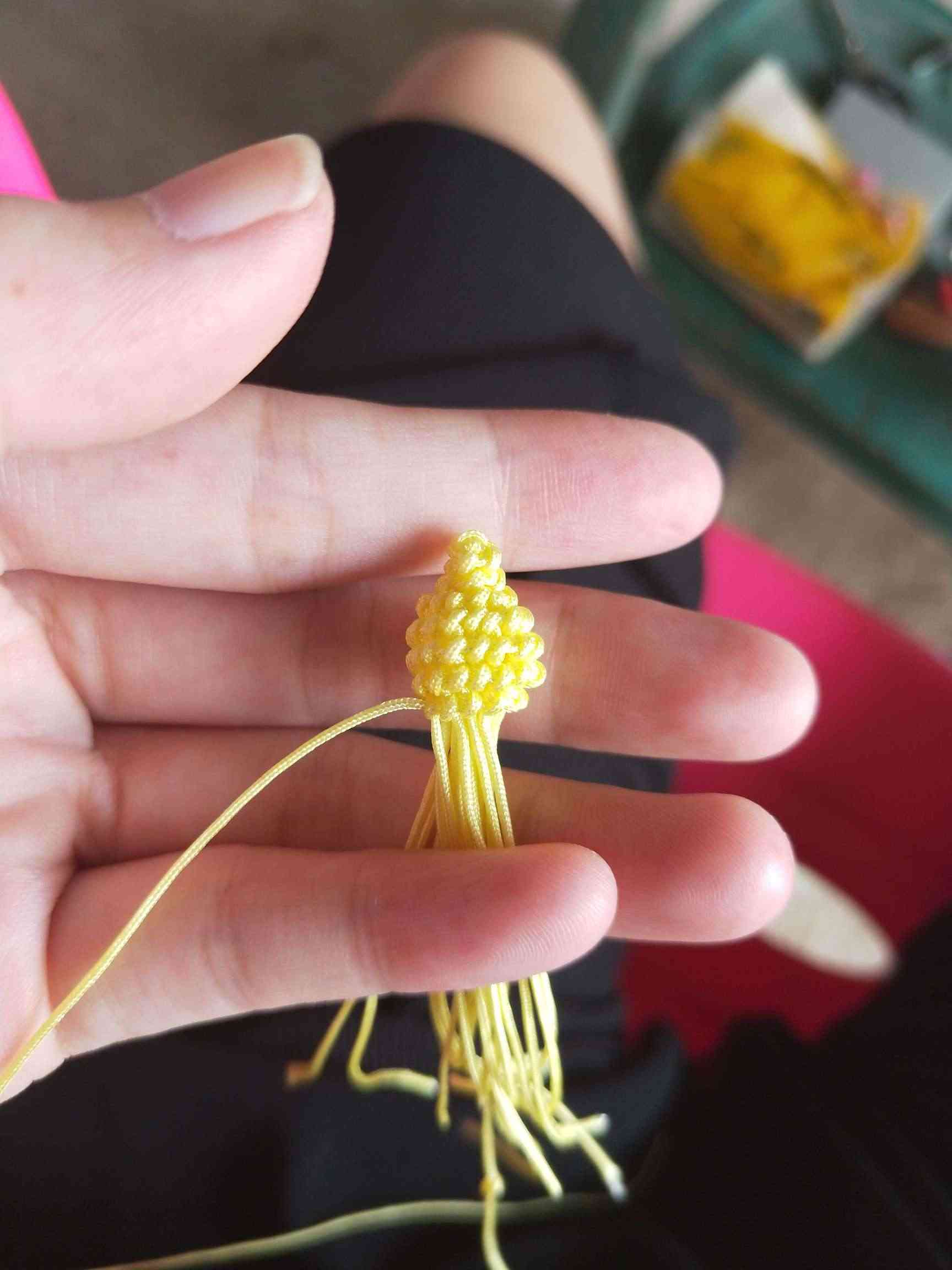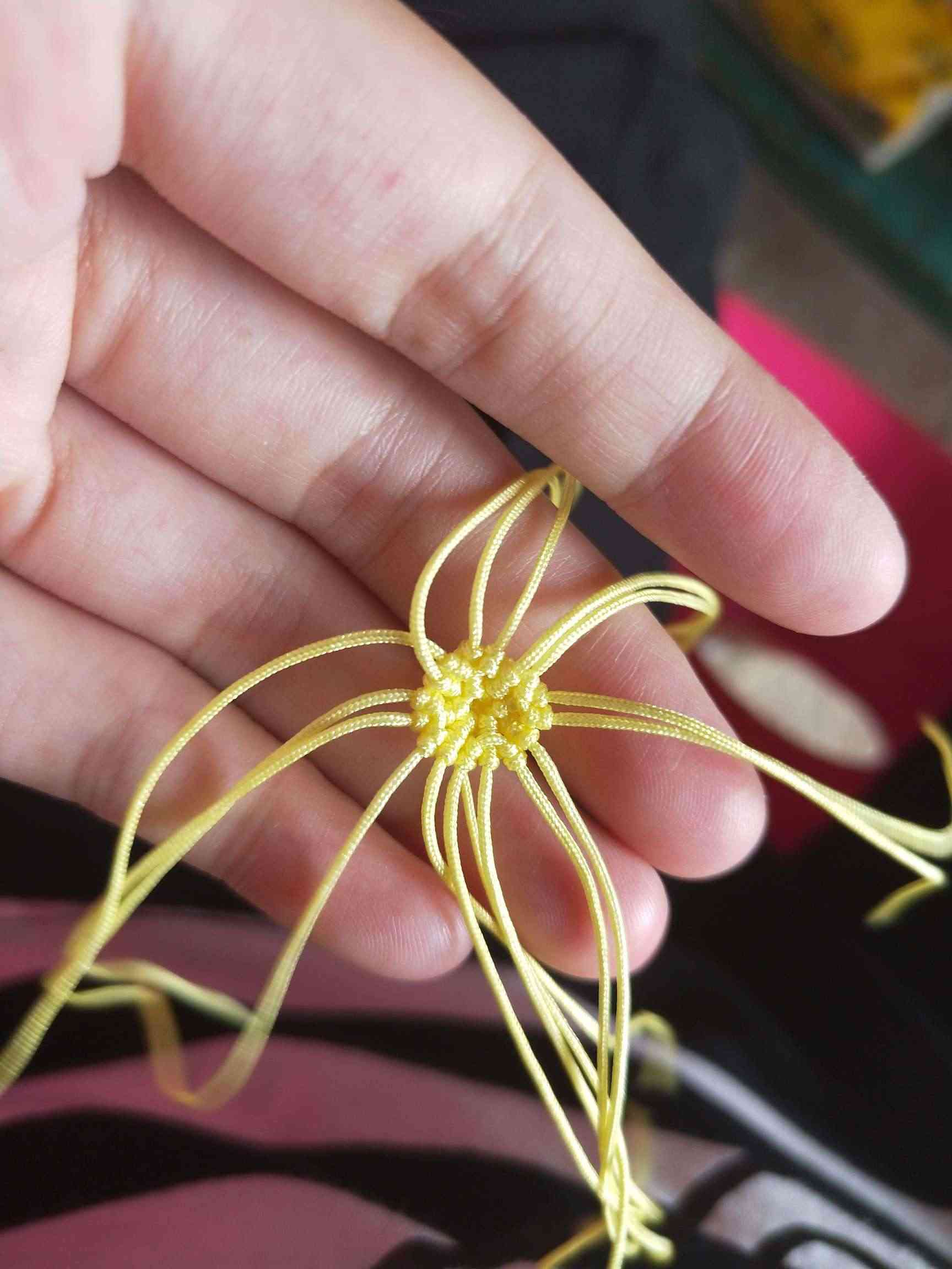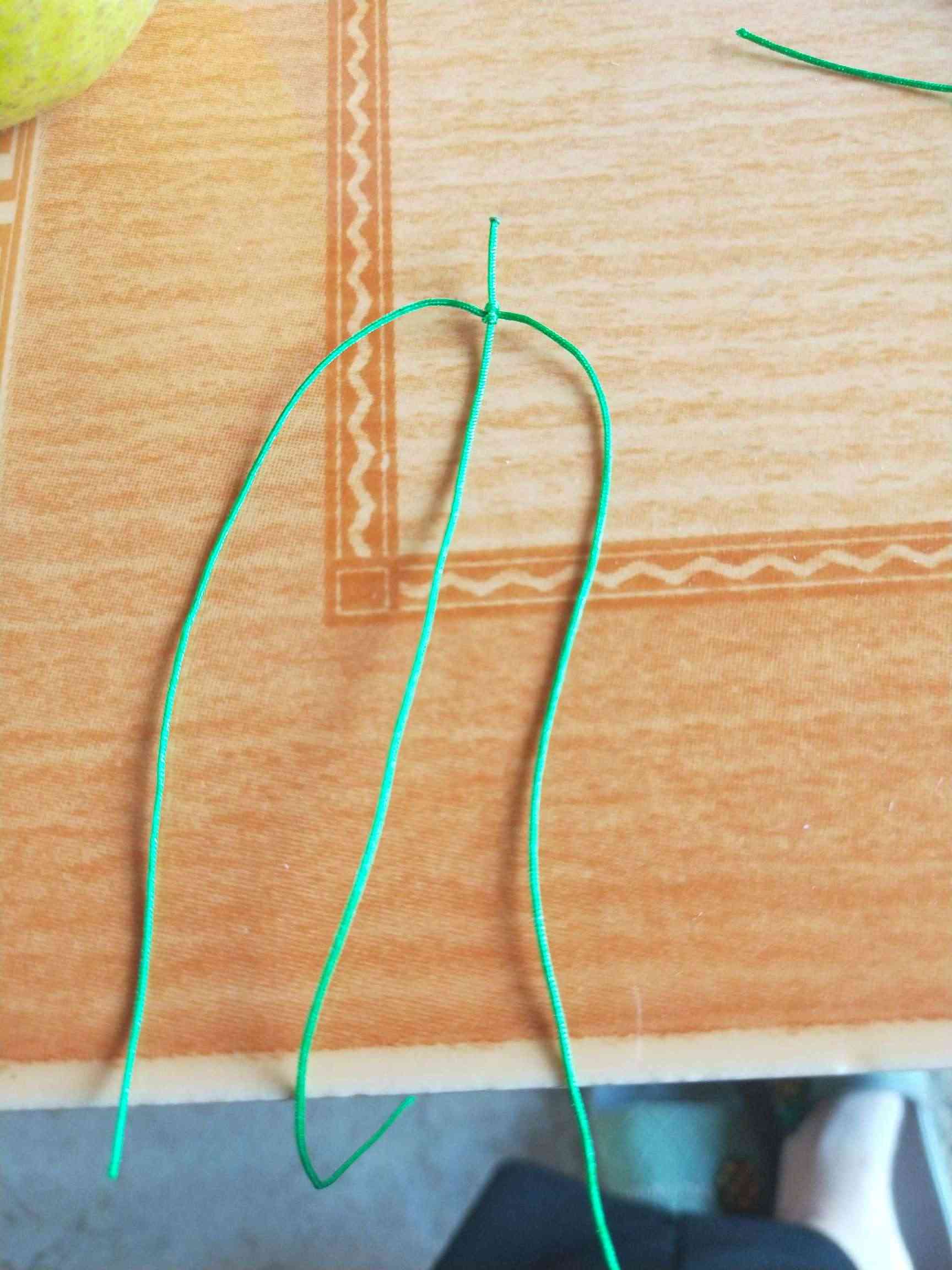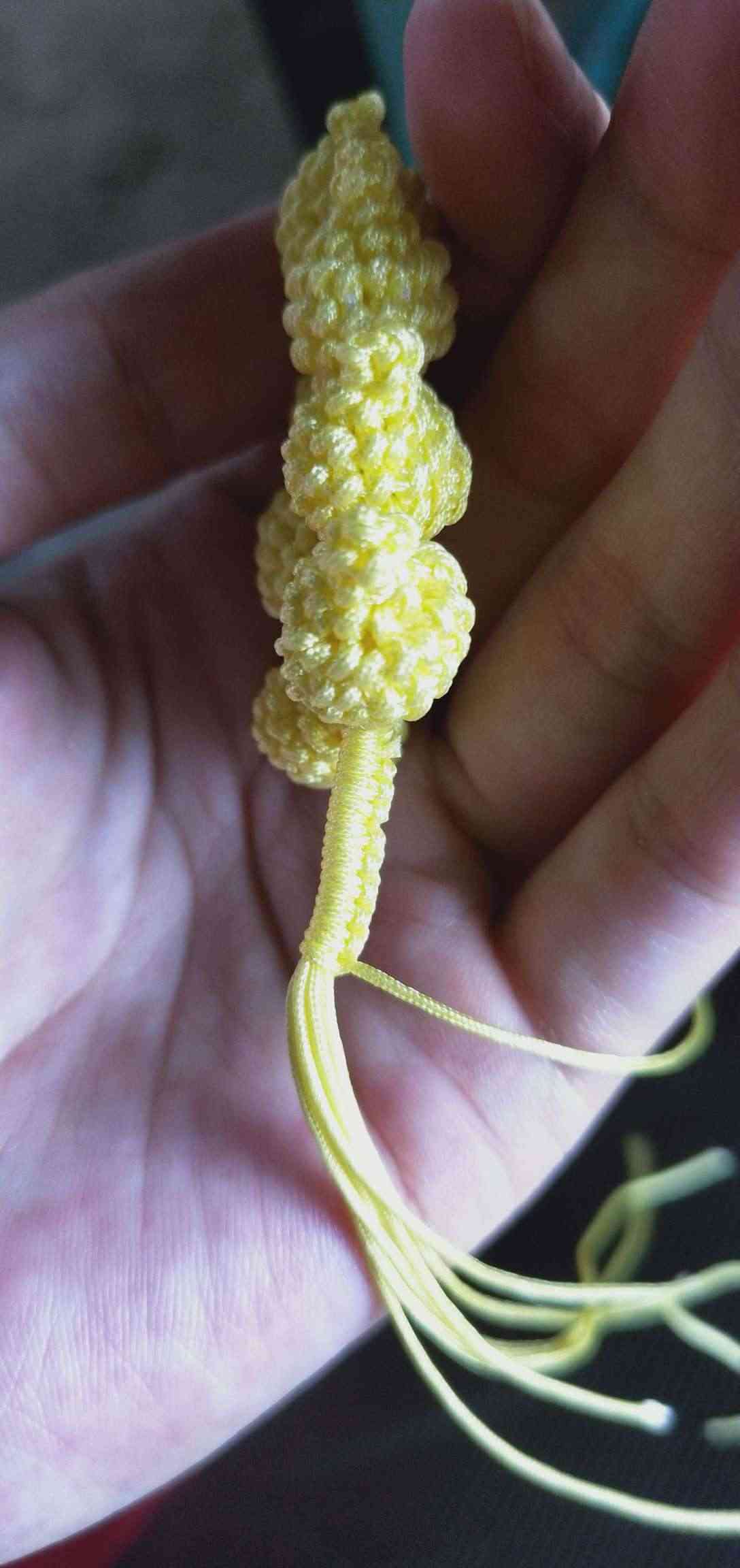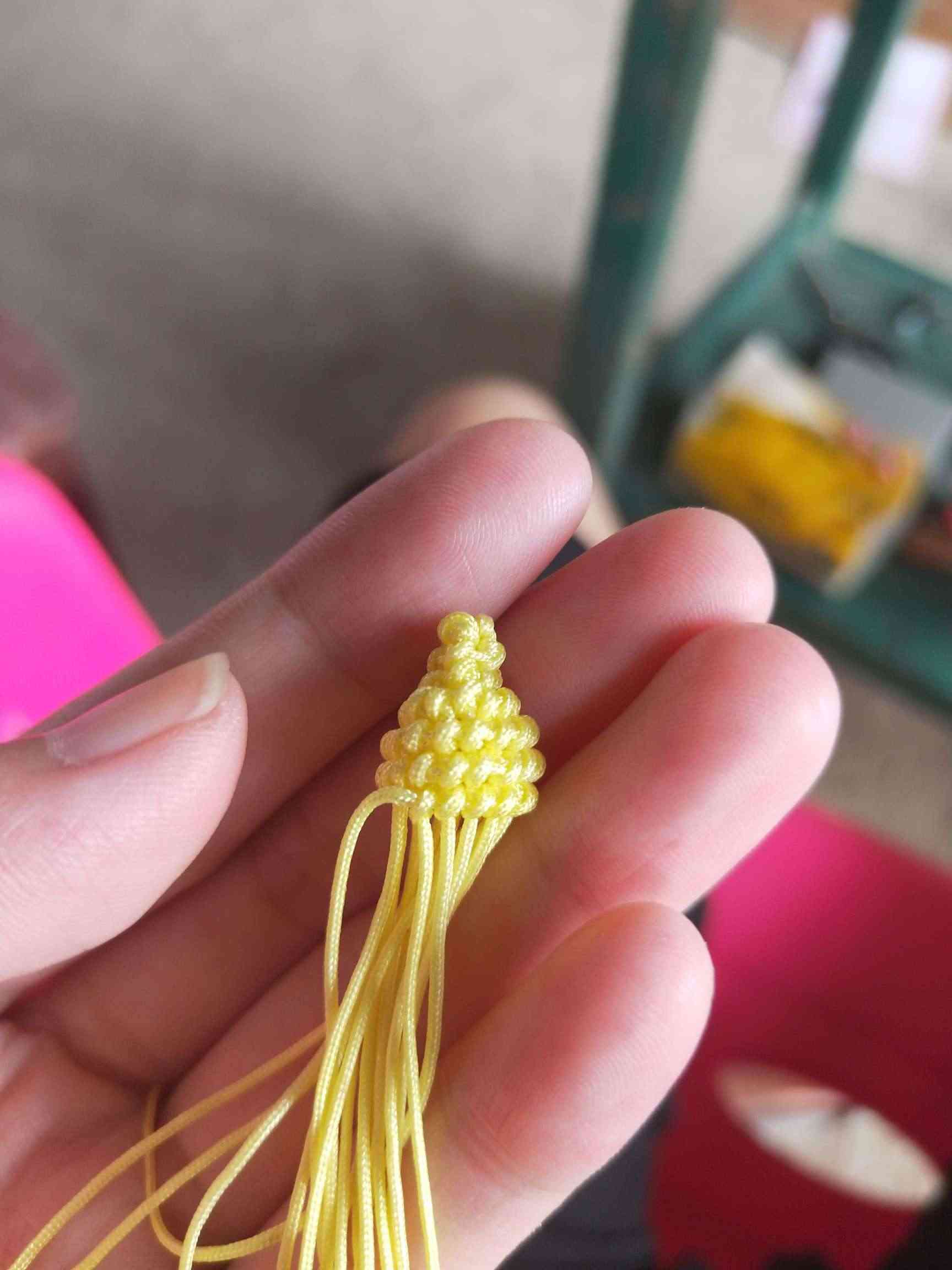1、两条黄色玉线,一条为30cm,一条为20cm做一个玉米结,留一根比较长,其他三条的长度一样长即可。