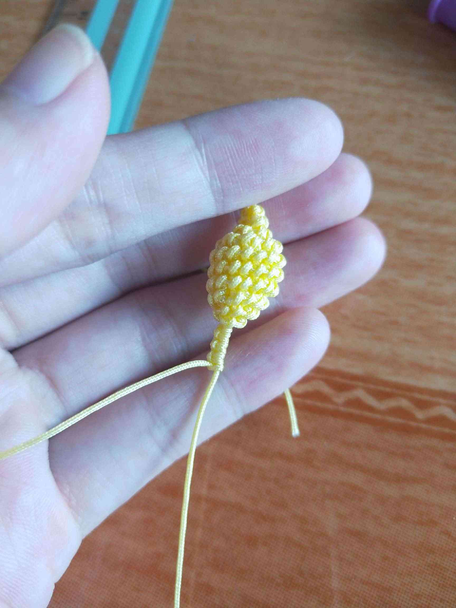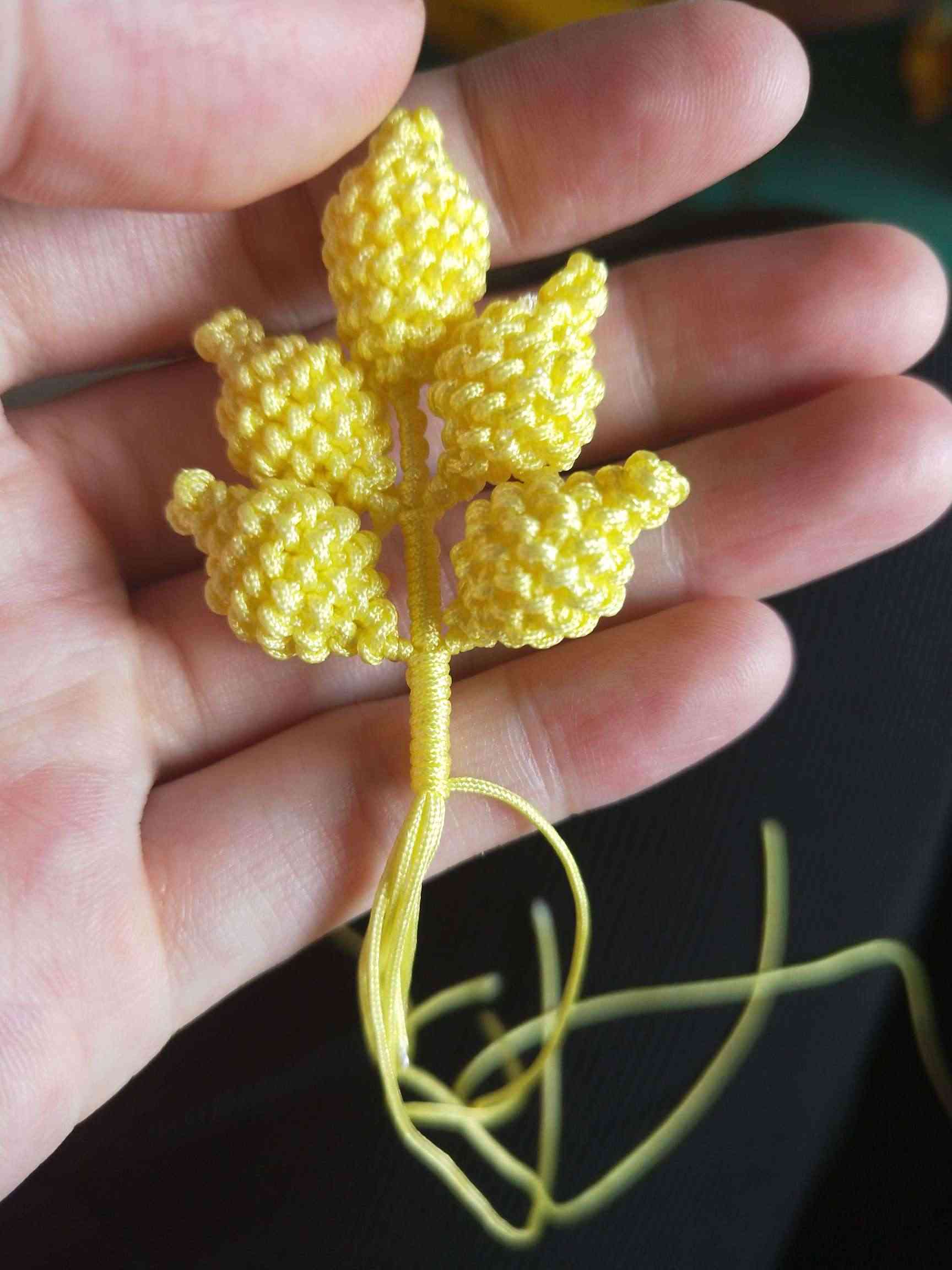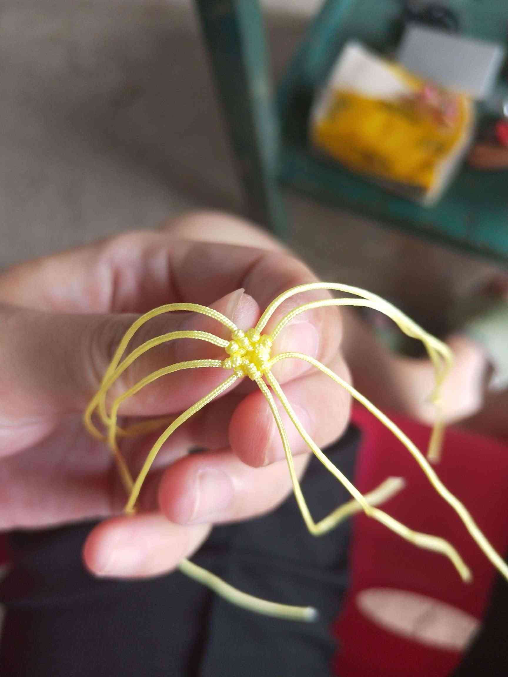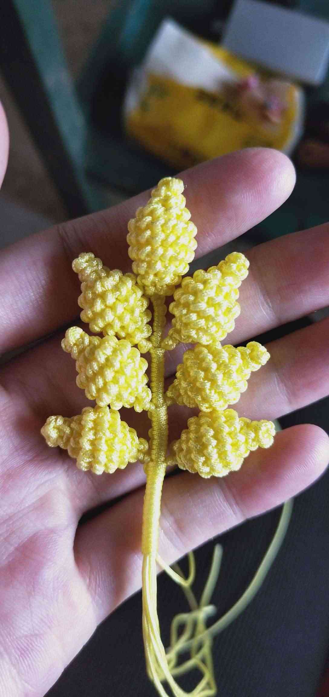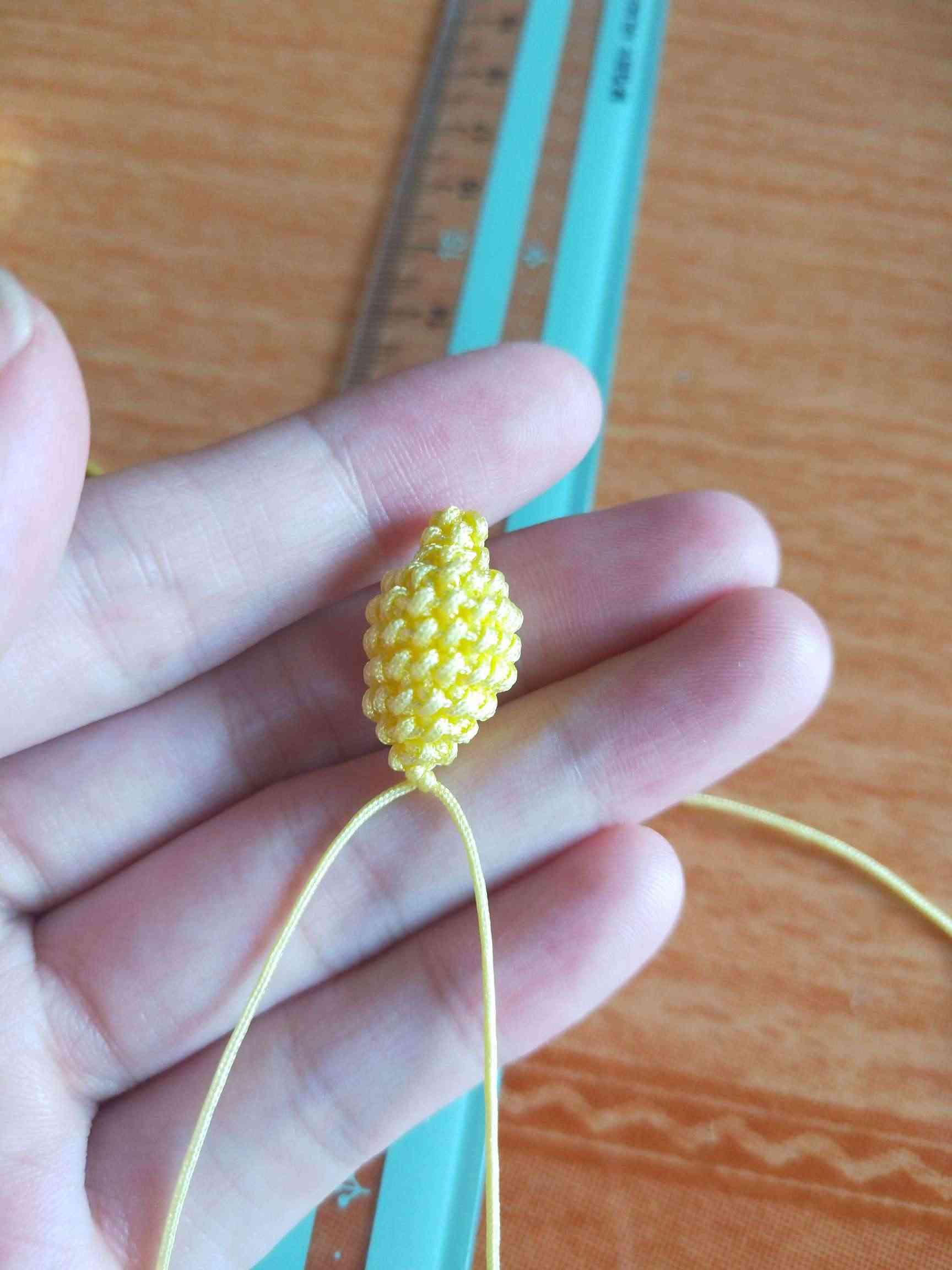 1、两条黄色玉线,一条为30cm,一条为20cm做一个玉米结,留一根比较长,其他三条的长度一样长即可。