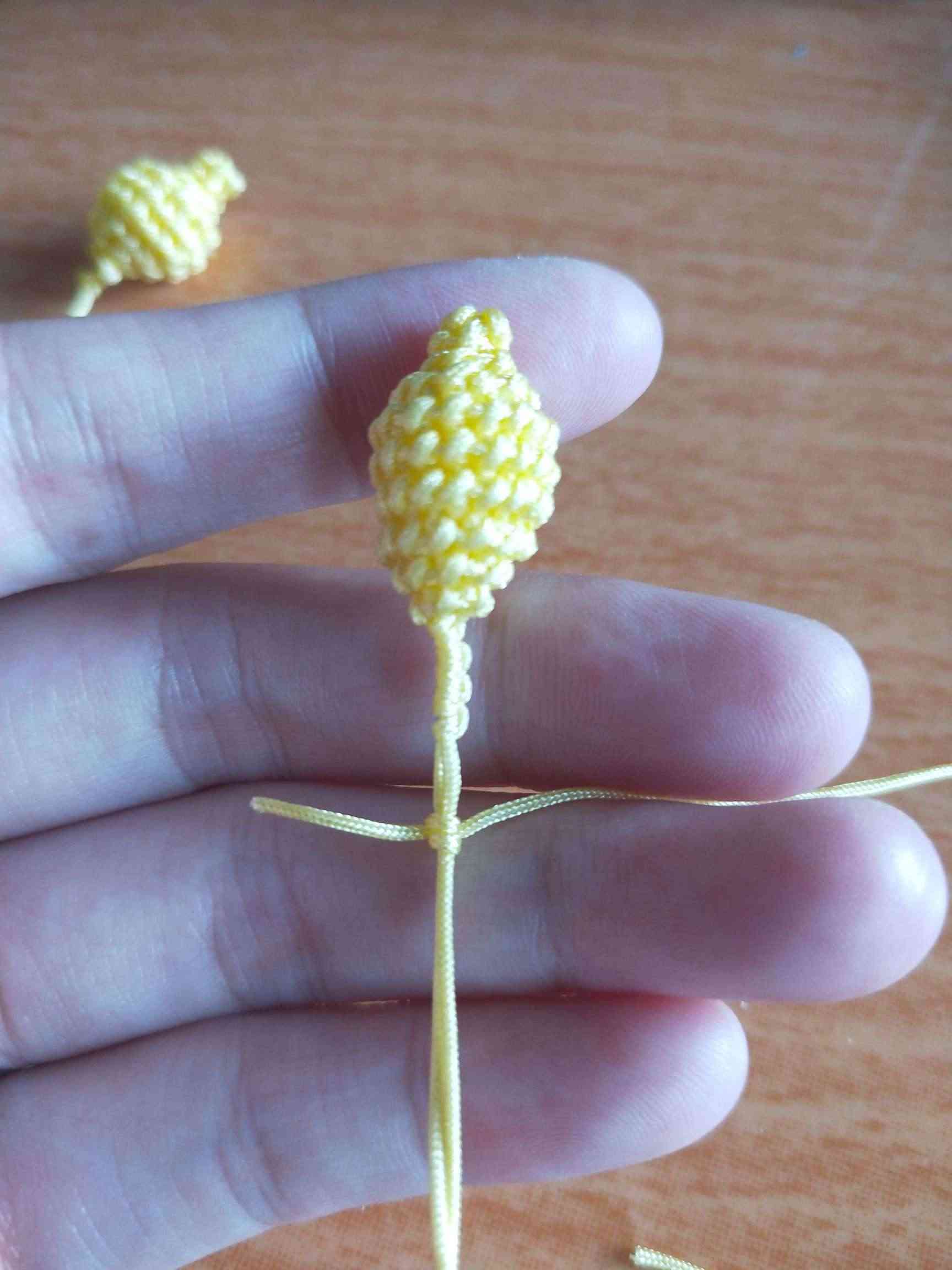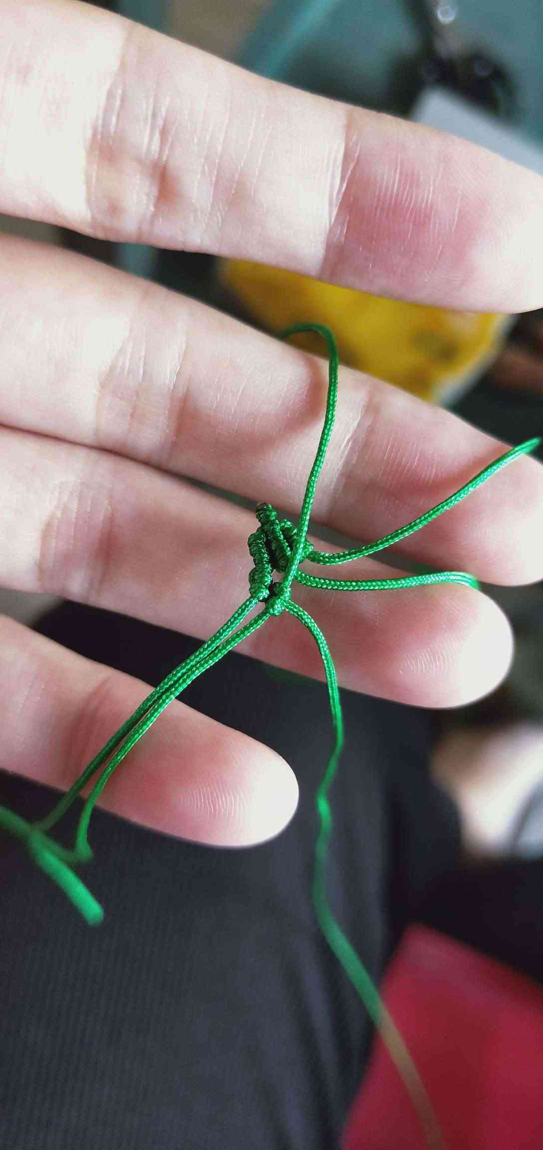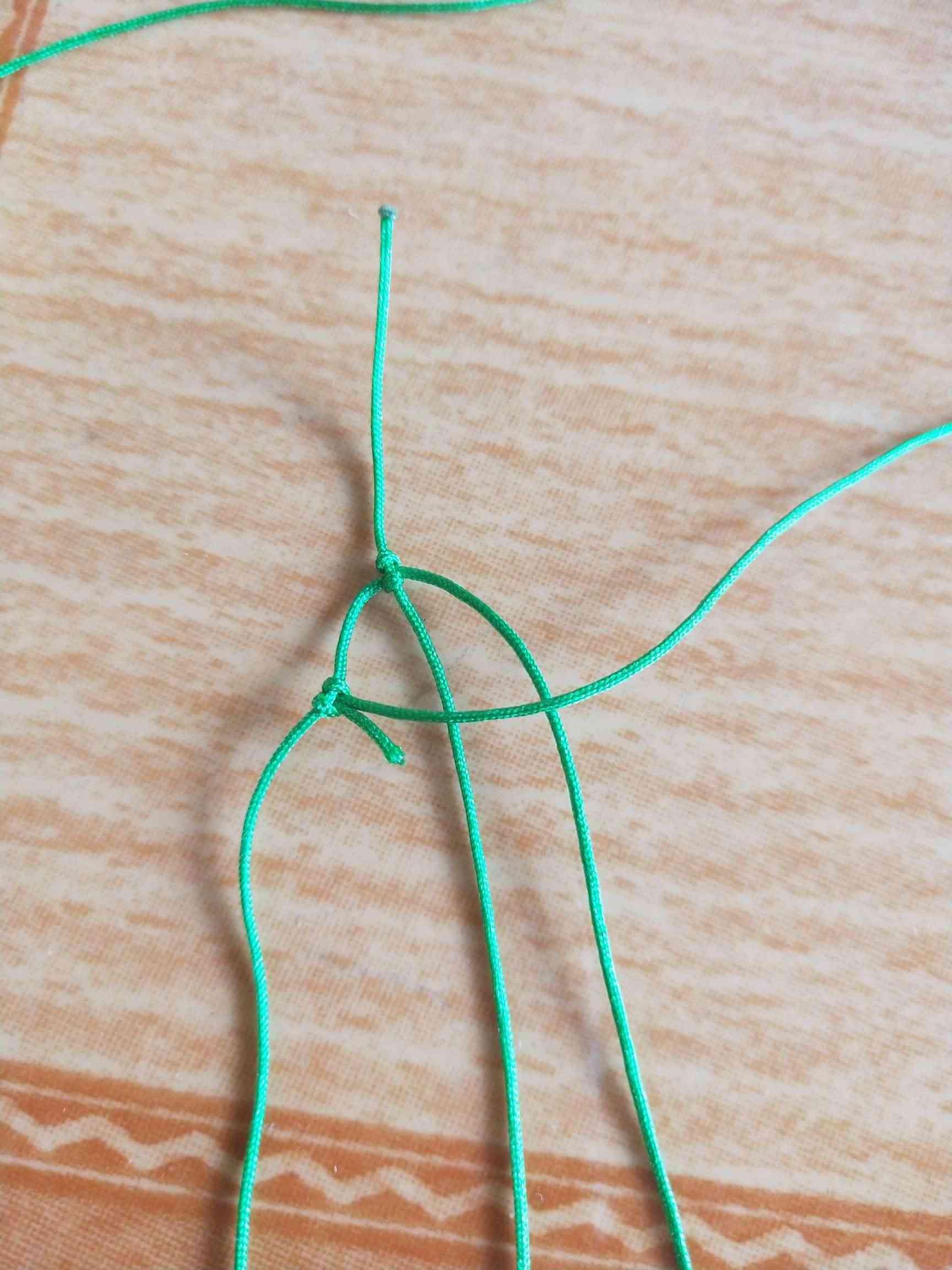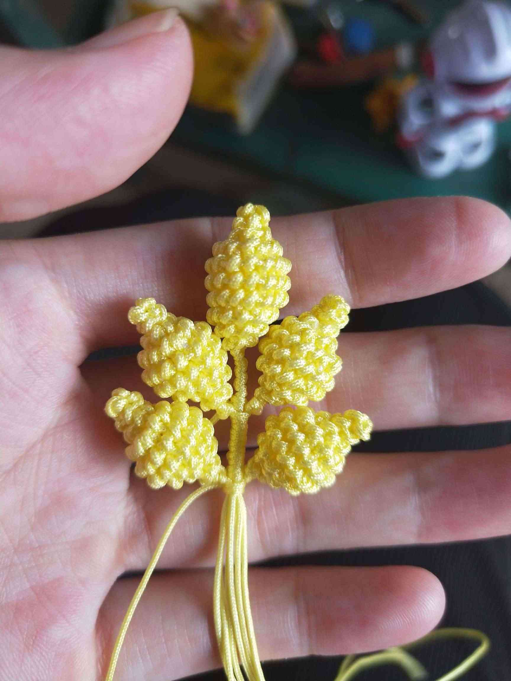 1、两条黄色玉线,一条为30cm,一条为20cm做一个玉米结,留一根比较长,其他三条的长度一样长即可。