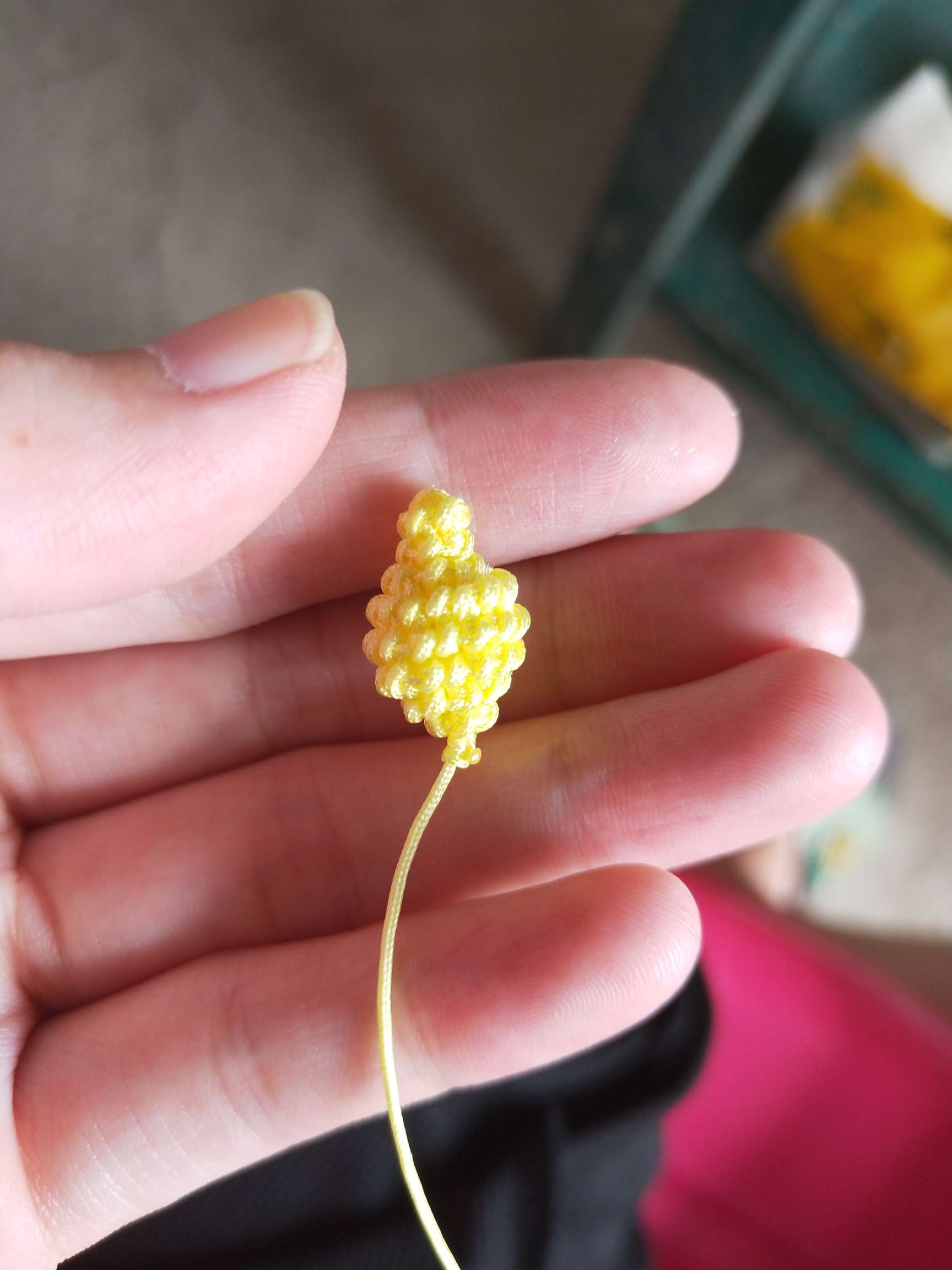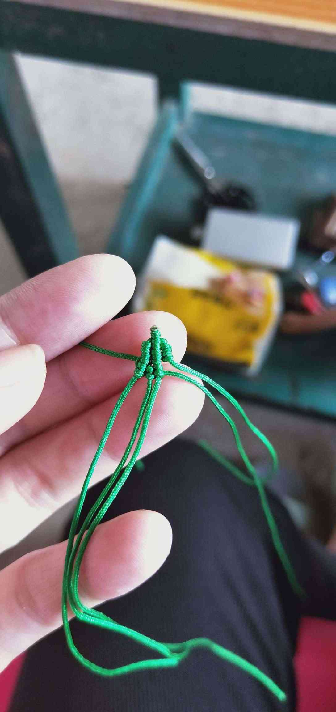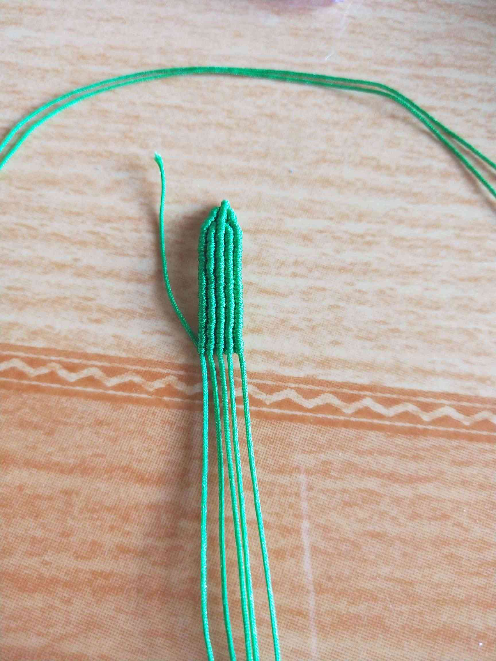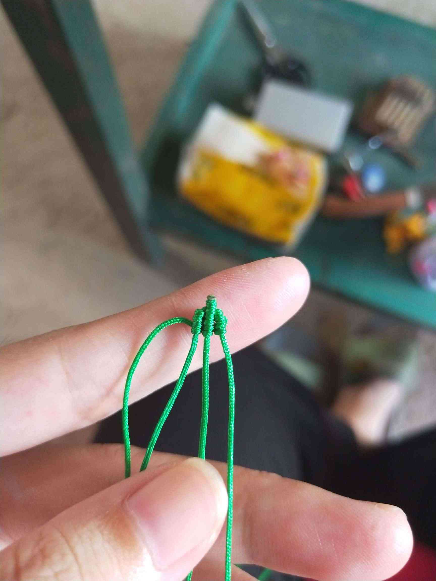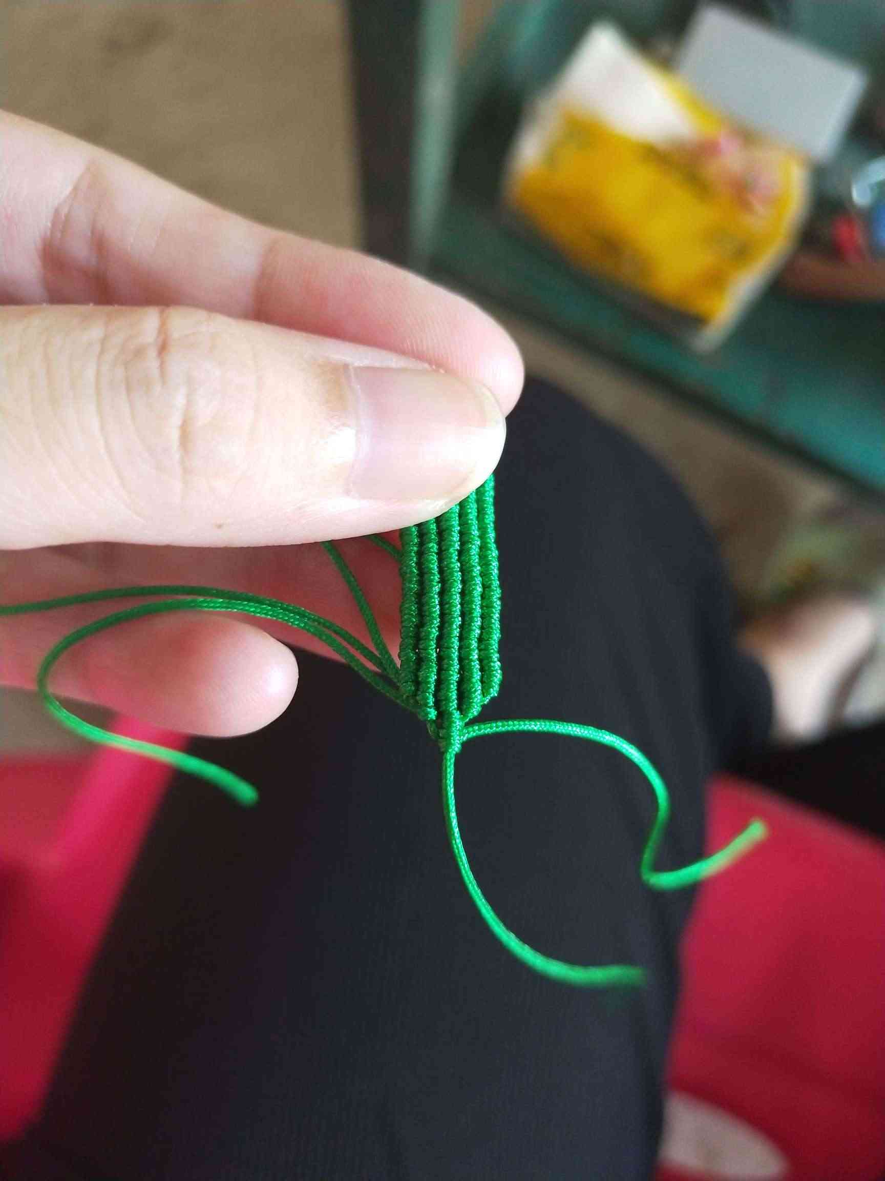 1、两条黄色玉线,一条为30cm,一条为20cm做一个玉米结,留一根比较长,其他三条的长度一样长即可。
