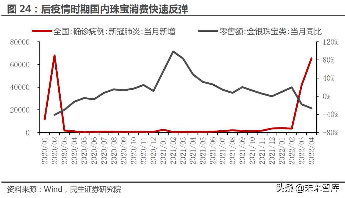 随国内疫情逐步得到控制,珠宝消费需求实现快速反弹。由于珠宝是典型的可 选消费品,叠加强线下体验属性,所以在 2020 年初国内疫情爆发初期,国内金银 珠宝零售额同比大幅下滑,但后续随疫情逐步得到控制,需求实现快速反弹,一方 面受益于海外高端消费的回流,另一方面则受益于婚庆需求的刚性回补。2022 年 3 月以来,深圳、上海以及国内多地疫情均出现反复,对上半年的珠宝需求形成压 制,但是我们认为在国内采取有力的疫情防控举措,疫情预计逐步得到平息,下半 年有望再次看到珠宝需求回暖,无需对短期景气度波动过于担忧。