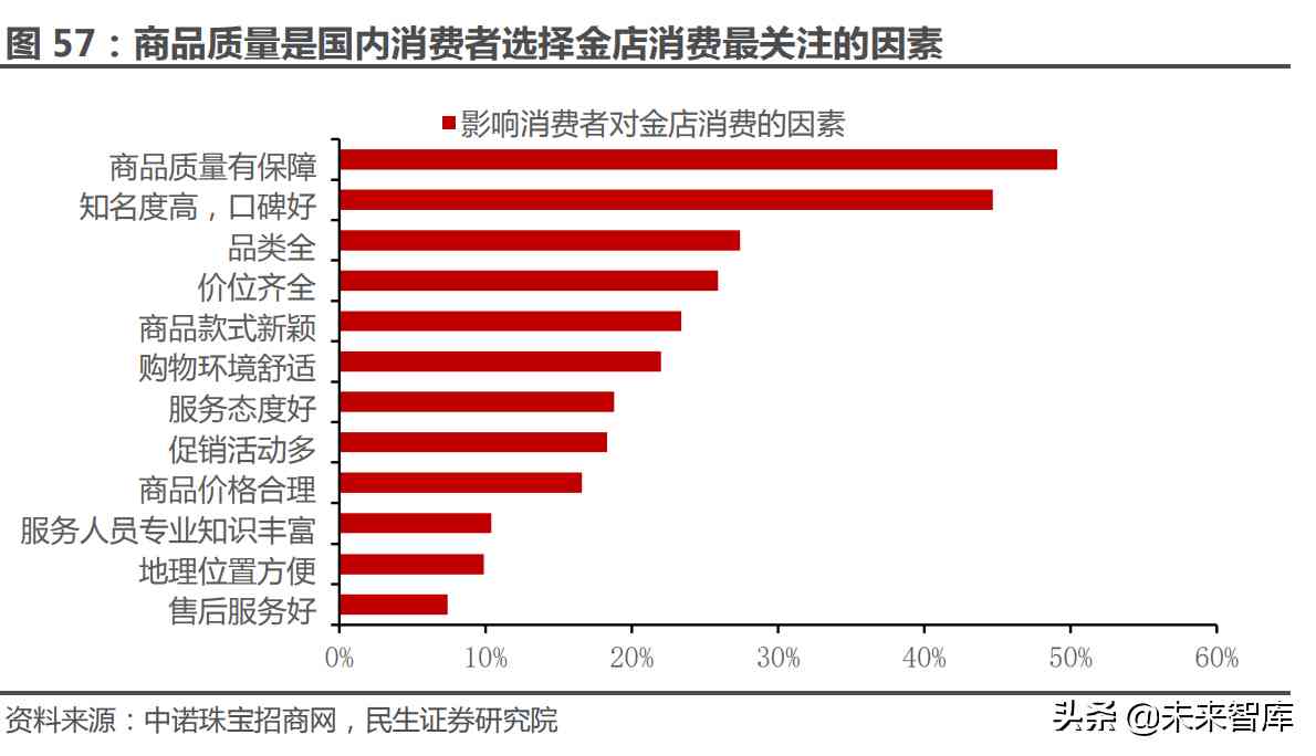 国内珠宝龙头产品质量与口碑强于区域市场的长尾品牌,下沉市场具备集中 度提升基础。由于珠宝单位价值量高,且现阶段产品相对同质化,特别是对于收入 水平较低的下沉市场消费者而言,产品质量是其最为关注的因素,而口碑与知名度 则是产品质量最好的背书。龙头品牌长期以来深耕一二线城市,在口碑与知名度上 已经形成一定积累,因此具备扩大市场份额的基础。