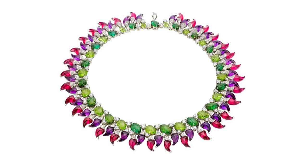 BVLGARI(宝格丽)推出的Festa della tradizione系列中的项链,镶嵌弧面形的卢比莱和紫水晶,以及雕刻的绿碧玺和橄榄石,灵感来自辣椒(图片来自于BVLGARI官网)