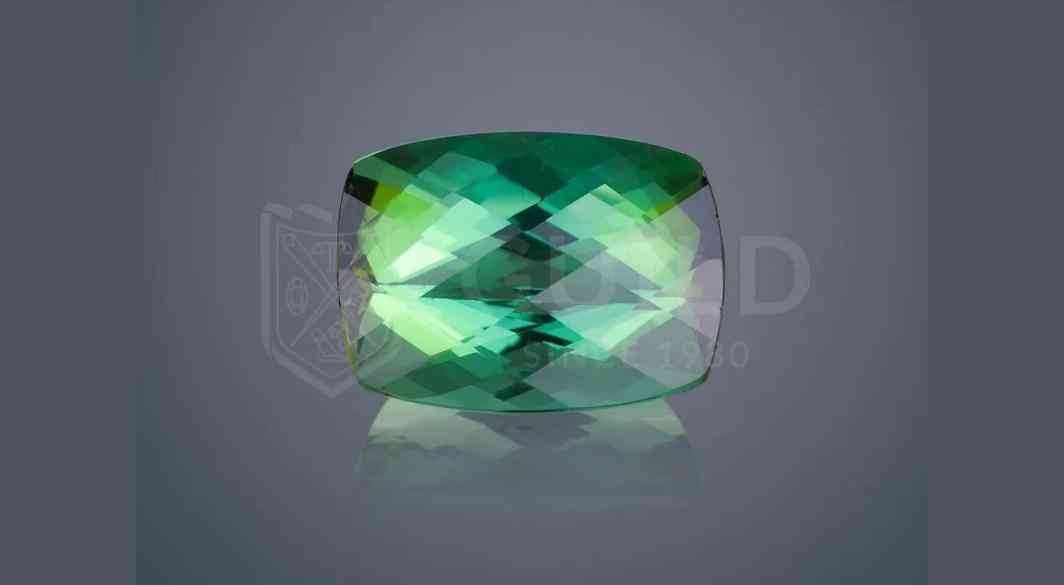 1.80 克拉的长方形梯级切工碧玺产自俄罗斯,拥有微绿蓝色色彩以及中浓色度©GIA