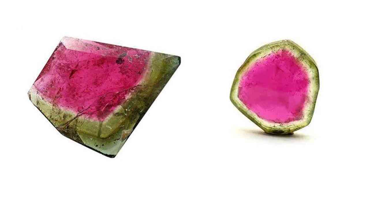 顾名思义,双色碧玺就是碧玺内有两种颜色,在双色碧玺中,最有知名度的当属"西瓜碧玺",这种碧玺内部呈红色,外部呈绿色,酷似切开的西瓜,所以有了"西瓜碧玺"之称。