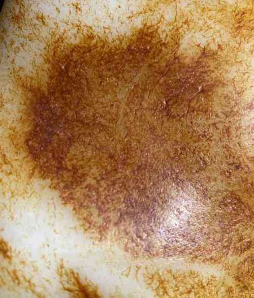有些假皮还有一个特征,那就是往往是一块一块的,而块与块之间没有什么关联,看起来就像是随意涂抹的油漆。就比如这个: