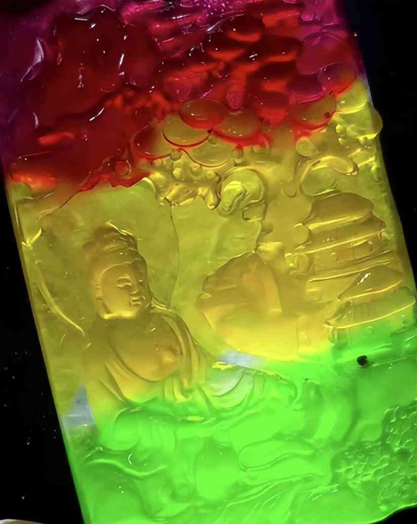 但是有些龙石种是不好拿变色效果来分辨的,比如深黄色透光发浅黄,帝王绿透光发阳绿,这些就更像普通的莹光效应。