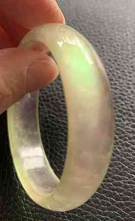 在这里顺便说一下,老翡翠里不是“十春九豆”,而是“十彩九裂”,遇到一条不裂的多彩翡翠,颜色还比较美的(虽说都是天然,有些颜色太过辣眼睛),也是凤毛麟角。这就不要挑玻璃种还是冰种了,只要不是糯种都很好。现在出现的多彩翡翠手镯大多只剩双彩(黄加绿、春带彩、白飘花)了,至多三彩,颜色还不太佳,或者三色的长度比例不协调。早些年笔者见过一对藏家收的七彩翡翠手镯,而且种水色俱佳,七色长短差不多,那对是极品,后来再没见过,见了一些五彩的,也大多有裂。