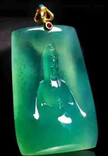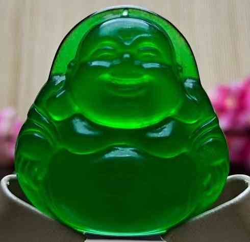 如下是一件皮料、龙石种、帝王绿、无裂、无纹、无棉、无明显色根的老翡翠佛公: