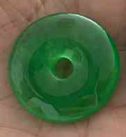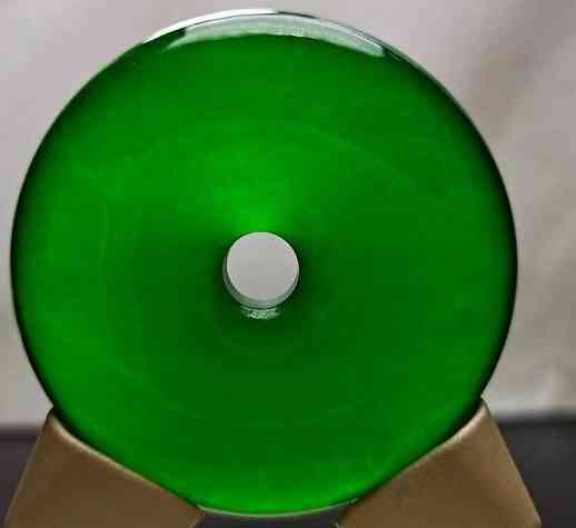 如下是一件皮料、龙石种、帝王绿、无裂、无纹、无棉、无明显色根的老翡翠平安扣:
