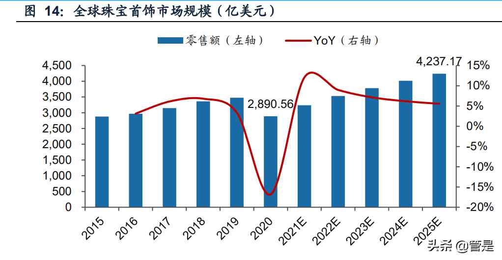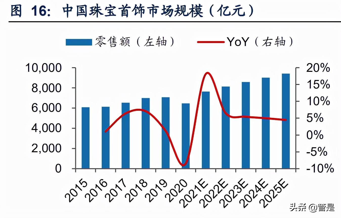 受疫情影响,2020年全球珠宝首饰市场规模2891亿美元,同比下降16.8%。但 除去疫情影响整体保持稳步增长态势,2015-2019年复合增速4.82%。根据 Bloomberg数据,全球珠宝首饰市场从2021年开始逐步回暖,预计2025年达到4237 亿美元,2020-2025年复合增速7.95%。(报告来源:未来智库)