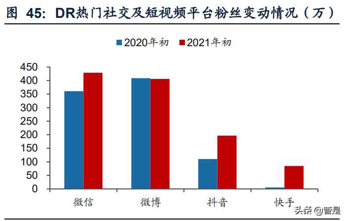 我们认为DR具备极强的互联网营销能力,体现为紧跟年轻用户的社交媒介演变, 丰富的内容创作输出,以及精细化的粉丝运营管理,而2020年爆发的短视频媒介相 比图文时代更具传递情感的能力,加速品牌理念的传播推广。从2010年的社区论坛 (人人网等),到2012年持续迭代的社交网络(微博、微信、小红书等),再到2019 年兴起的短视频媒介(抖音、快手等),DR全域布局年轻用户活跃的各个媒介平台, 但同时也随着用户社交语言的进化而加大新流量媒介的投入。