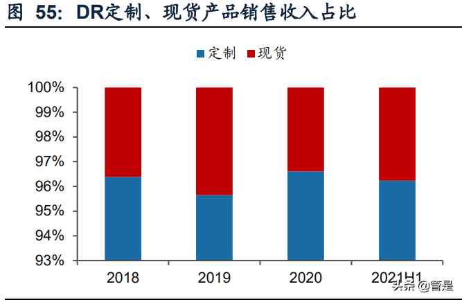 定制化是DR另一个区别于同行的经营模式,而定制化也是突破传统珠宝经营痛 点的重要方式。传统珠宝品牌大多以现货销售为主,我们认为主要有两个原因:(1) 商家希望促成顾客在门店完成销售,离店后的不确定性和流失率都很大,本质上是 产品和品牌辨识度不足以粘住用户;(2)大多数品牌以加盟模式为主,品牌与经销 商之间是to B关系,品牌更希望经销商多拿货,把资源和精力聚焦在自己身上。而 DR从一开始就采取定制化销售模式。在服务流程上,顾客在门店样品选择款式,而 后根据自身需求确定钻石参数、戒托材质、手寸大小及个性化刻字等定制内容,预 付30%定金,10-15天的定制周期后付尾款。2018-2021H1公司定制产品销售收入占 比均超过95%,远超同行水平。