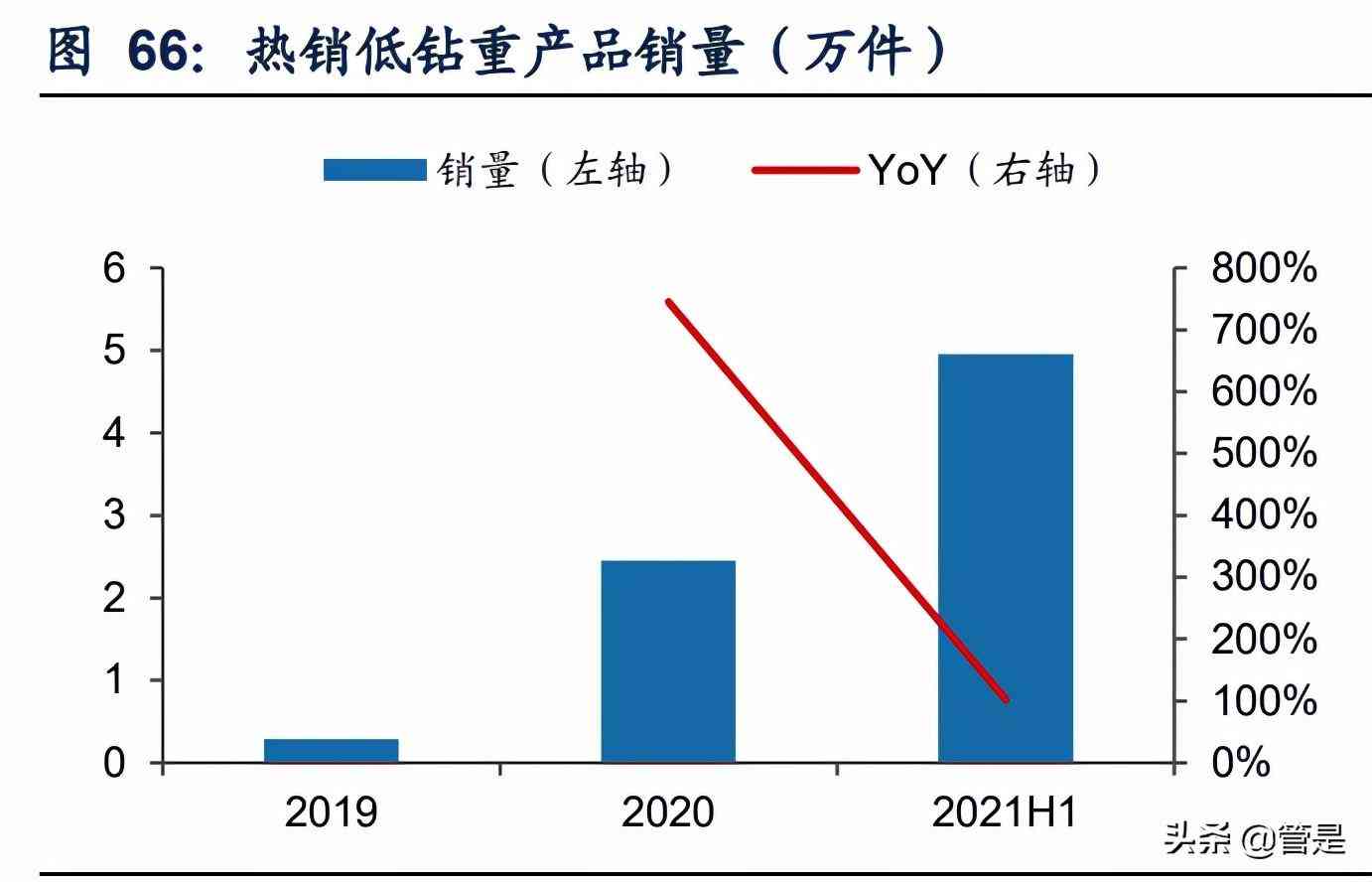 整体客单价保持稳定,爆款低单价产品导致均价小幅下滑。2020年至2021年上 半年,DR求婚钻戒客单价的下滑,主要由于短视频媒介关于“穷和敷衍是两回事” 的价值观讨论,促进了DR一款1399元的钻戒热销,拉低了整体客单价。2020年热 销低钻重产品销量达2.45万件,占求婚钻戒的14.35%。结婚对戒客单价稳步上升, 由2018年的0.4万元增至2021年上半年的0.46万元,同比增长2.22%。