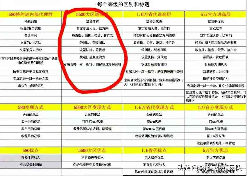通过对比,可以发现,奢姿的4个价格代理标准仍然不变,还是580元,5500元,1.6万元,5万元,40万元,以及上线不封顶为主。就是内容上有所变化,从之前的彩妆和护肤产品,转向了培训文案和打造短视频暴富为主。