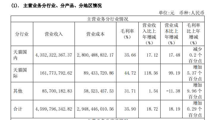 与之相对应,天猫国内和天猫国际的营收分别达到了43.52亿元、1.62亿元,约占总营收的94.62%、3.51%,通过其他平台实现的收入则仅有0.86亿元,约占总营收的1.86%。