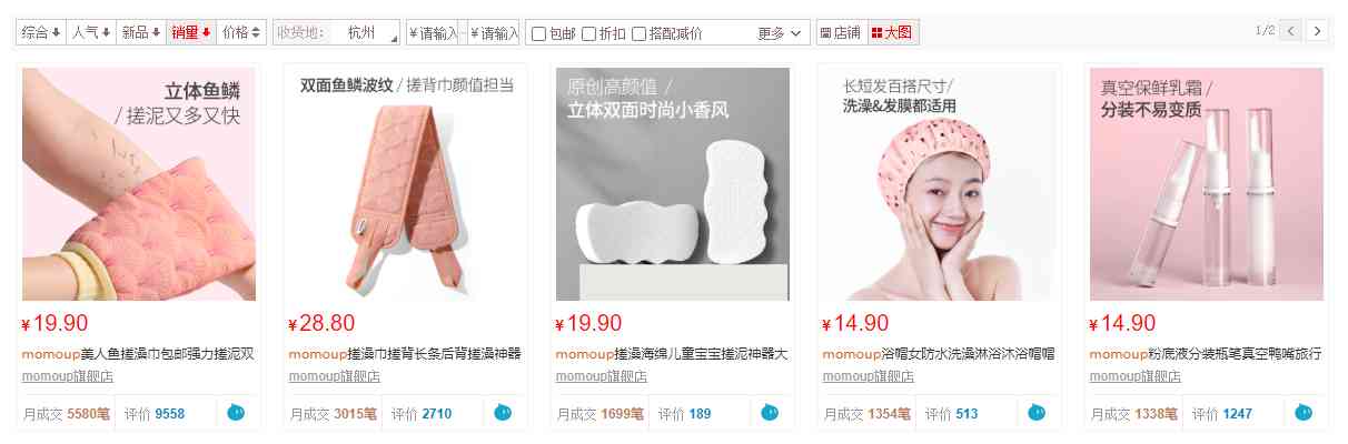 AI财经社查询天猫平台发现,以销量排序,月销量最高的是momoup的一款搓澡巾,促销价19.9元,月销量5580笔。
