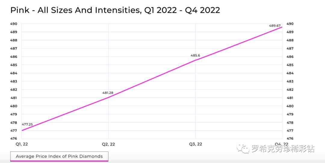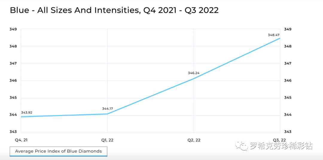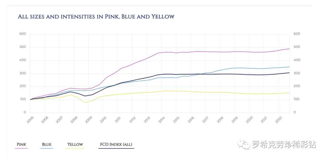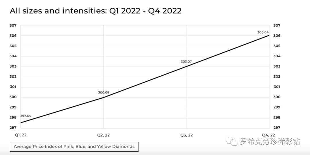 “2022年对于所有尺寸和饱和度的黄色彩钻来说是一个非常不错的年份。看起来,视觉等级高且形状特定的黄色钻石的上涨幅度超过了指数反映的范围。粉色彩钻的表现与往年相比没有明显变化,然而,蓝色钻石的表现不如预期,可能是由于中国市场的限制,这似乎很快就会发生改变。”