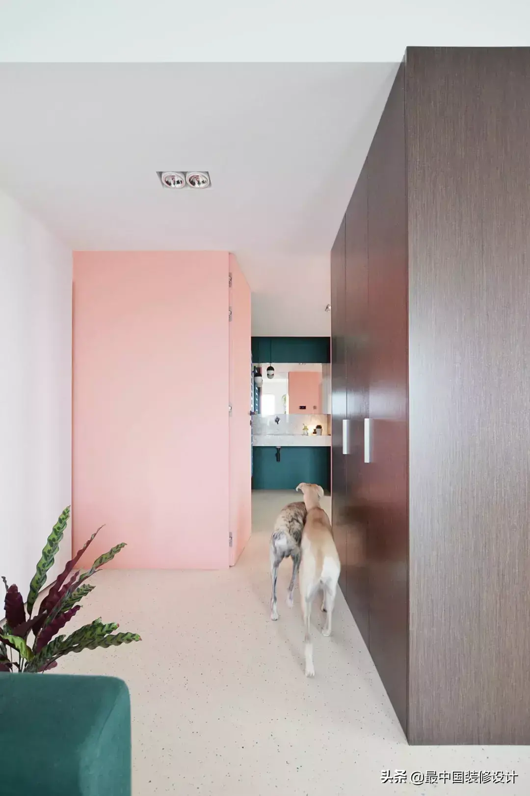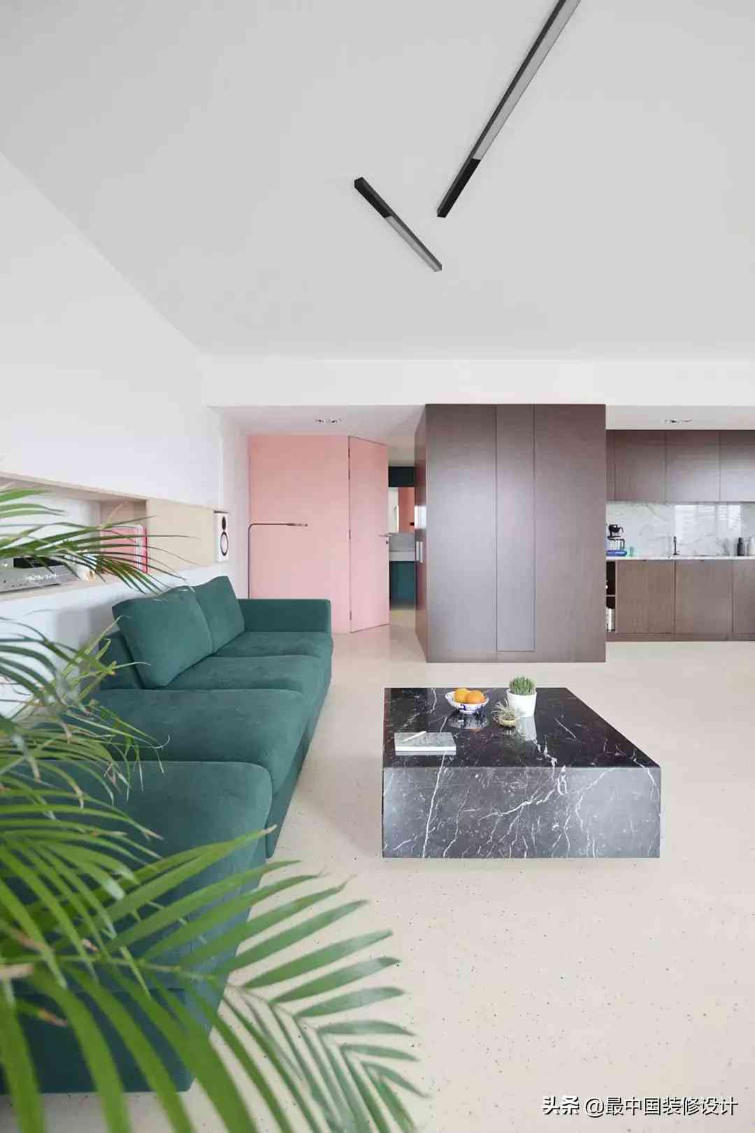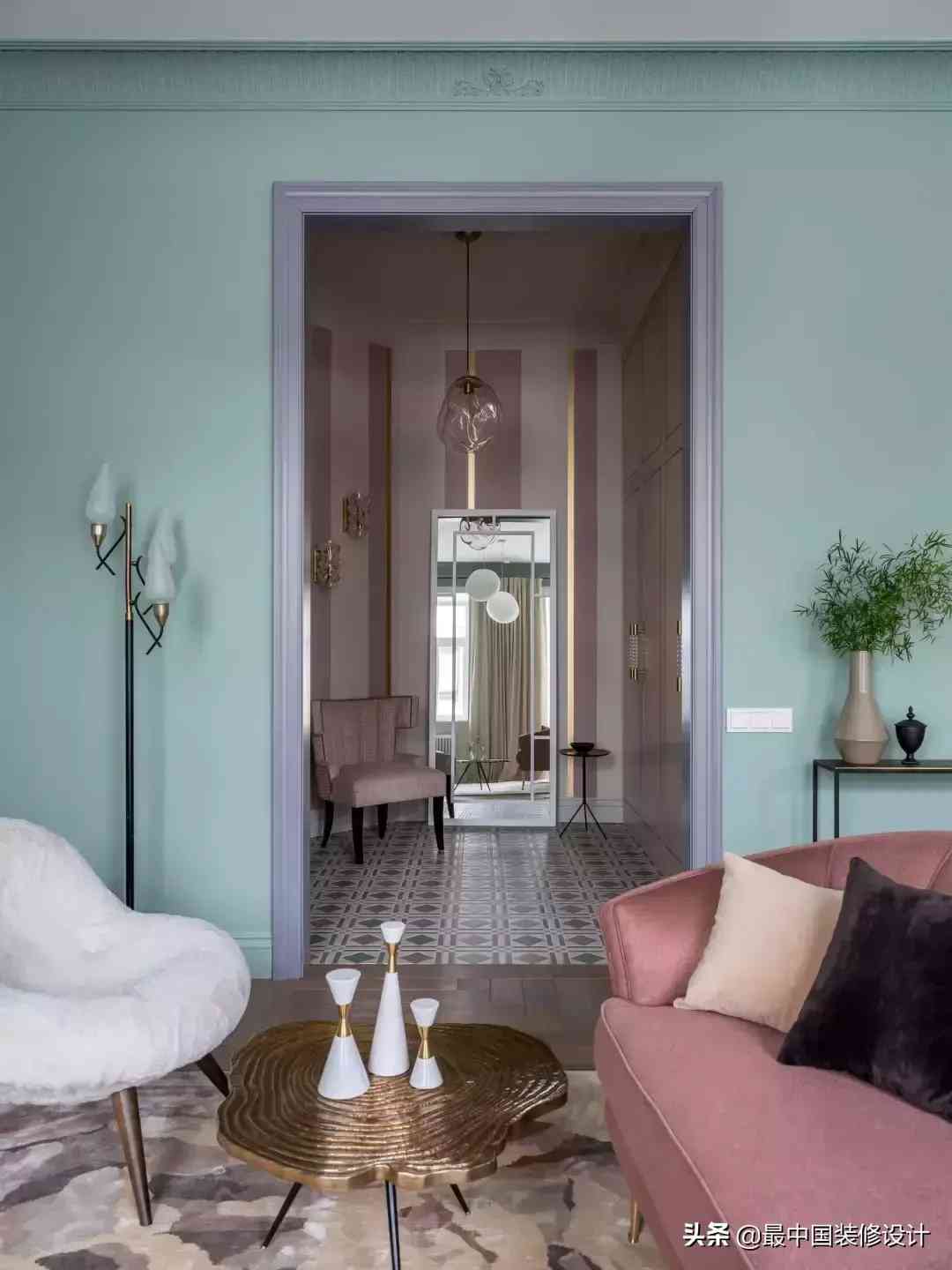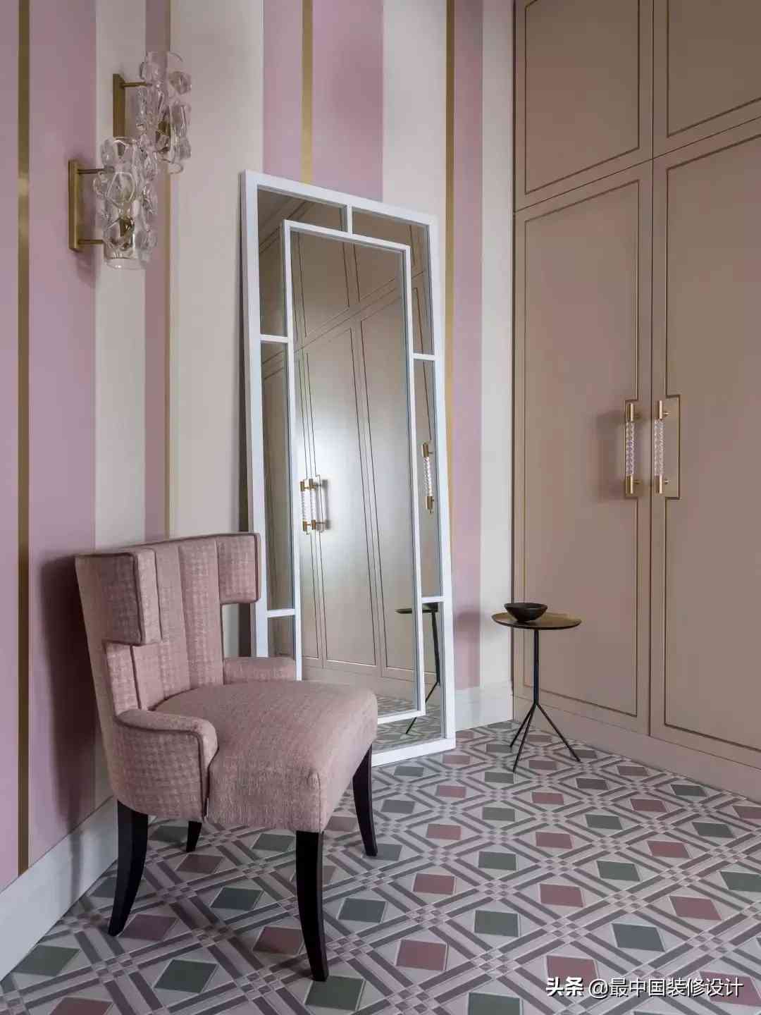 特别是这种少女粉+金,一不小心就可能腻歪到别人。好在地面的薄荷绿和粉色搭配的几何地砖足够有趣……而在壁柜和单人沙发的肉粉色综合下,又削弱了少女粉的腻。