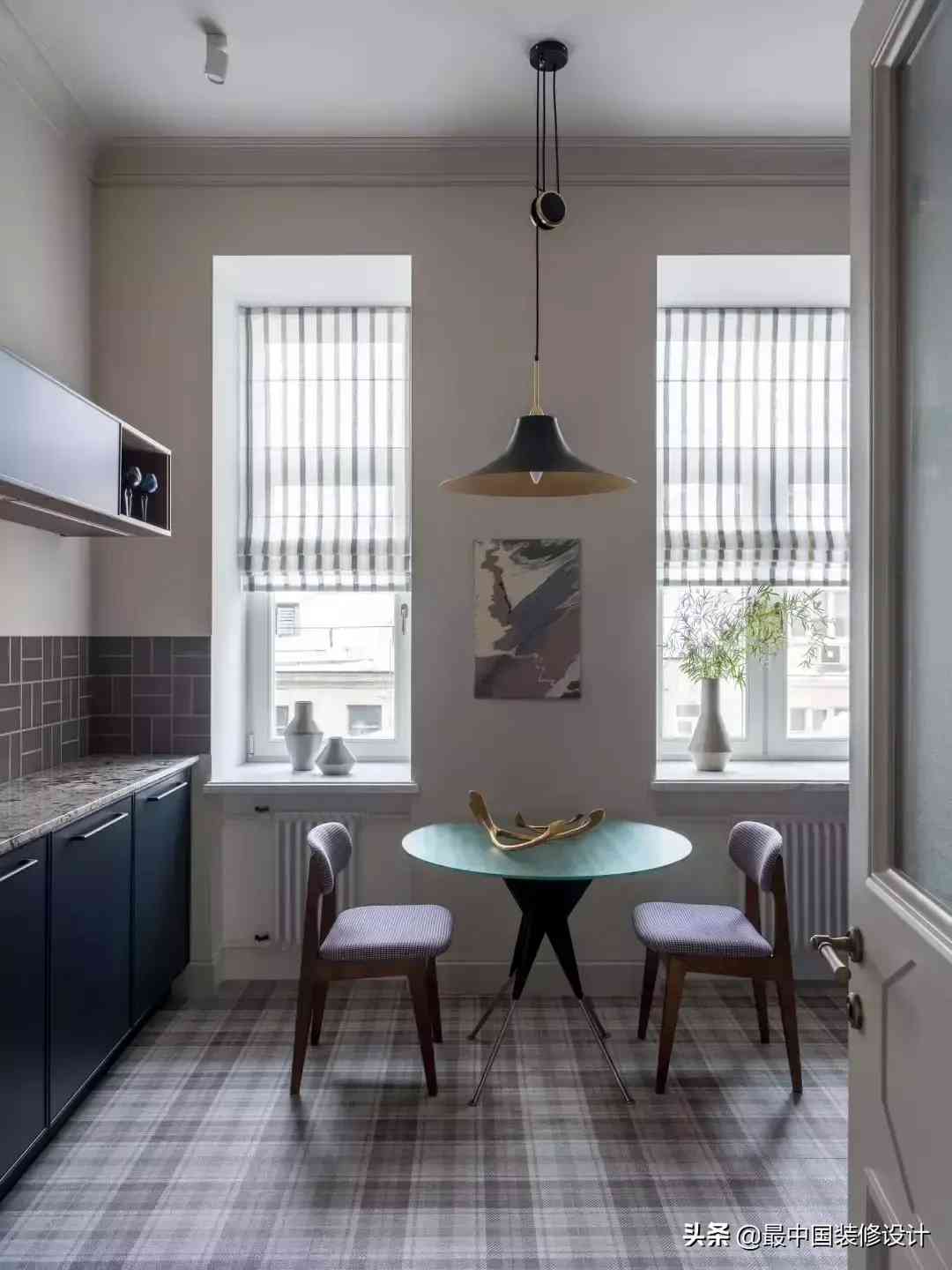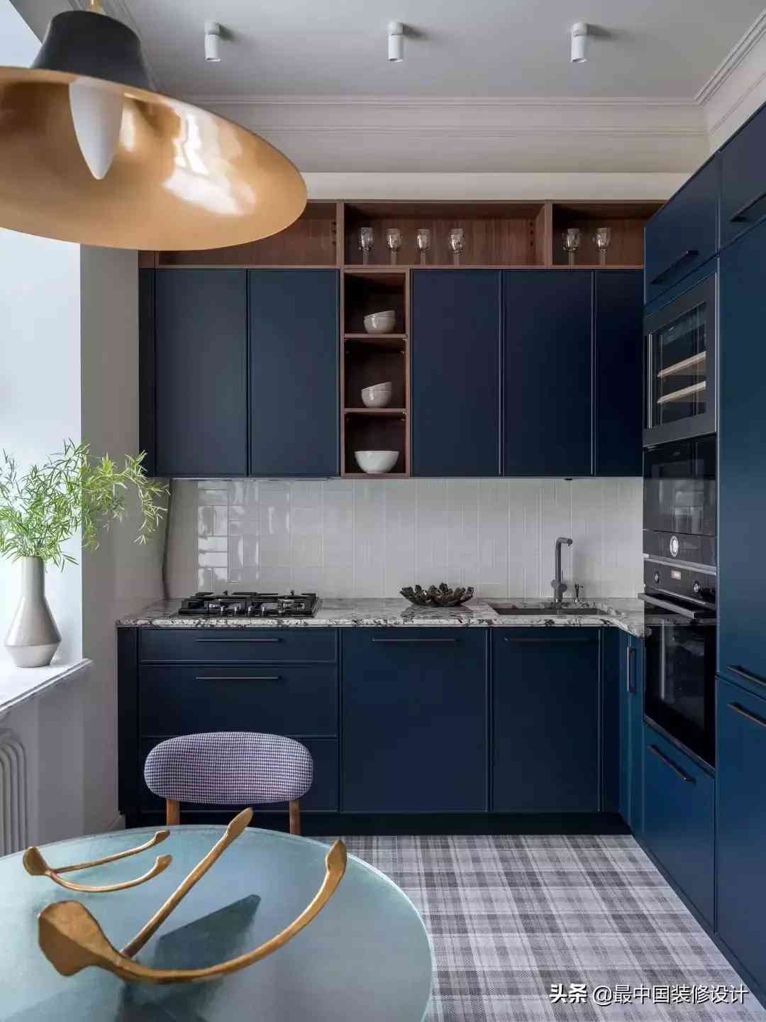 而它的橱柜,就完全符合昨天阿喵说的复古路线的万能搭配公式——莫兰迪蓝色系橱柜+金色拉手。