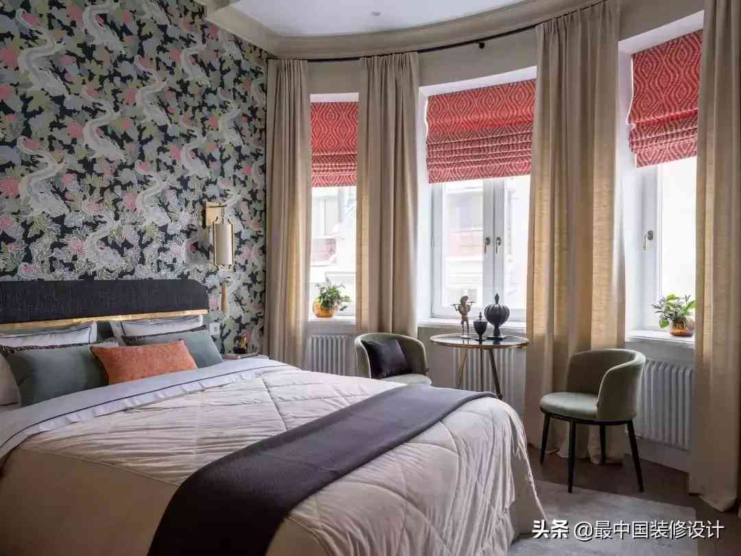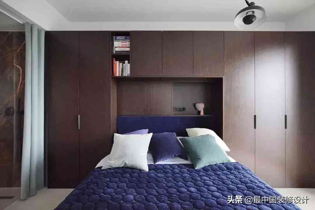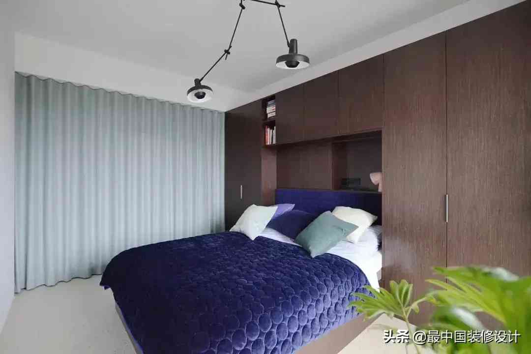 虽然后期靠床上用品的图案和亮色扳回一层,但还是有点稍显老气。倒是顶上的长臂灯,还是让人眼前一亮。