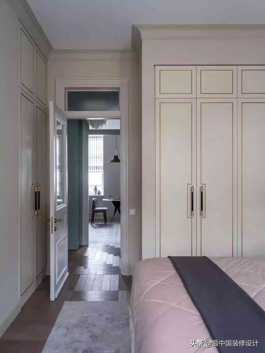 卧室的深木色镶板橱柜,几乎和厨房的材质如初一撤。我猜是采购同一材料,会让成本降得更低。