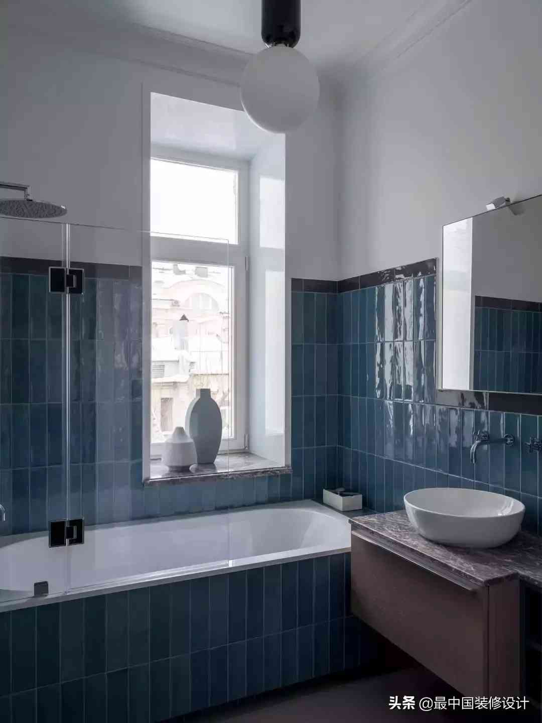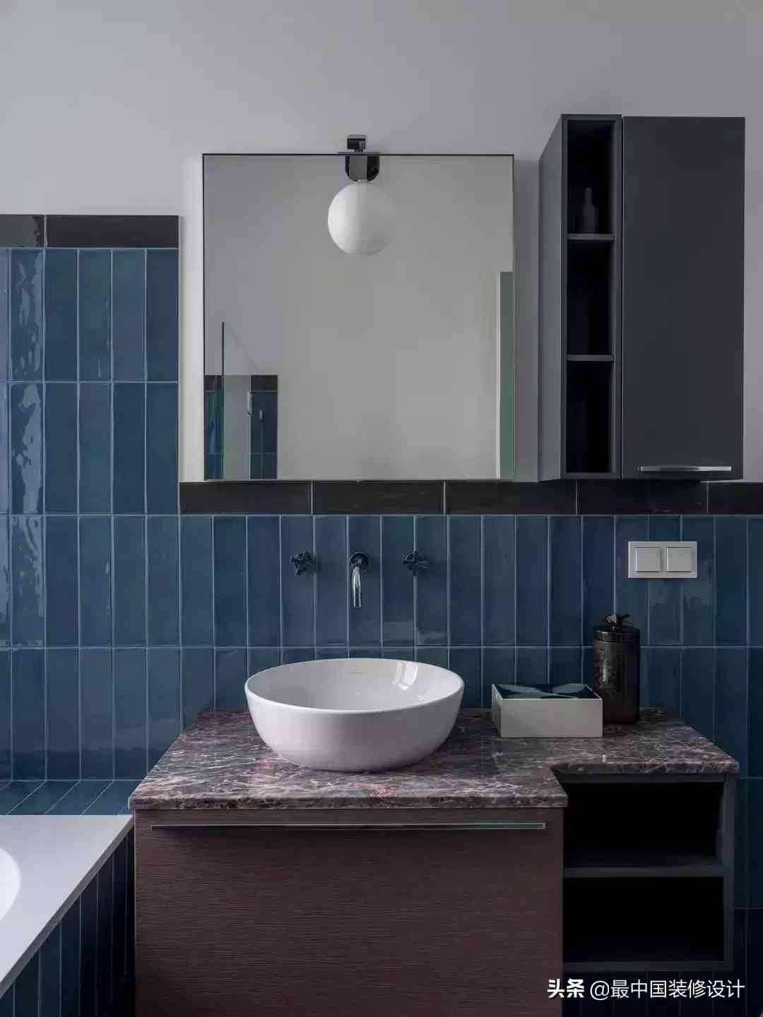 看完暖色调,来到卫生间,又见到了和厨柜对应的的莫兰迪蓝。