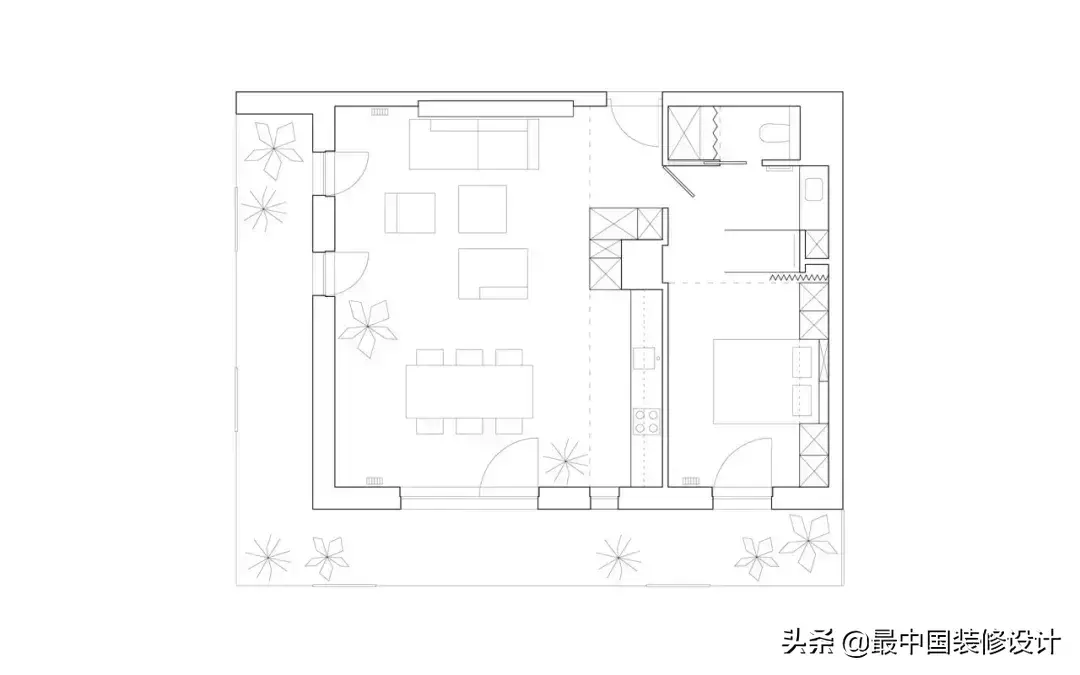 几株充满生机的绿植,为整个空旷空间带来了更为活泼的点缀,避免呆板。